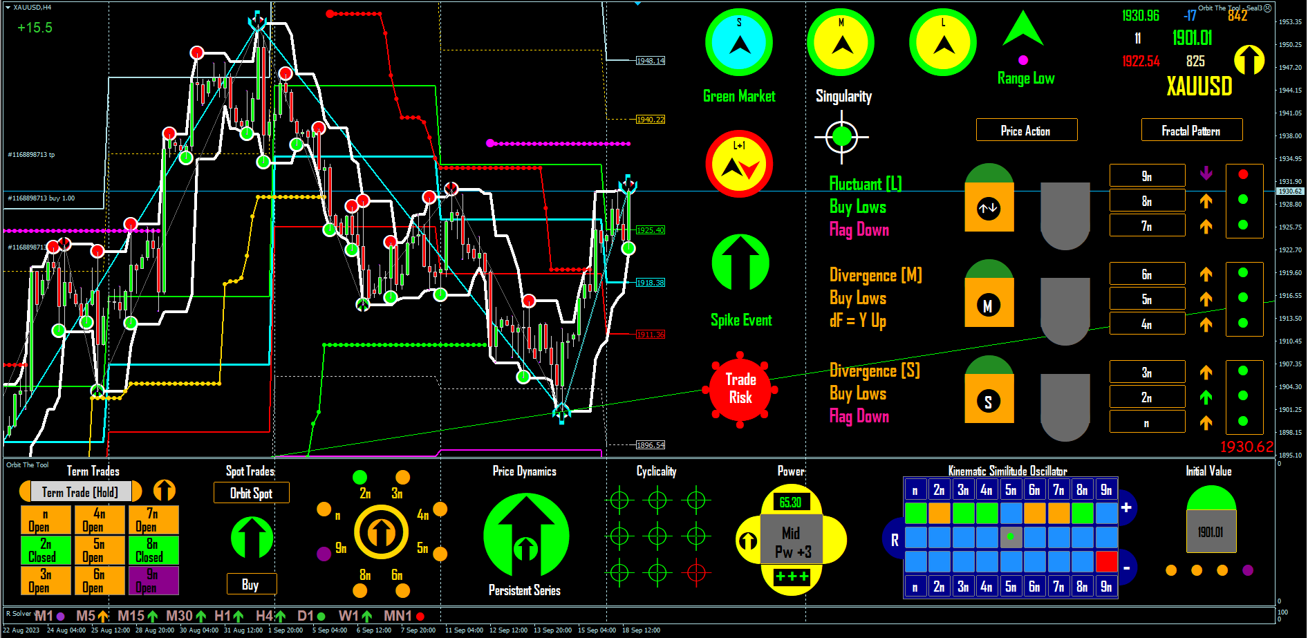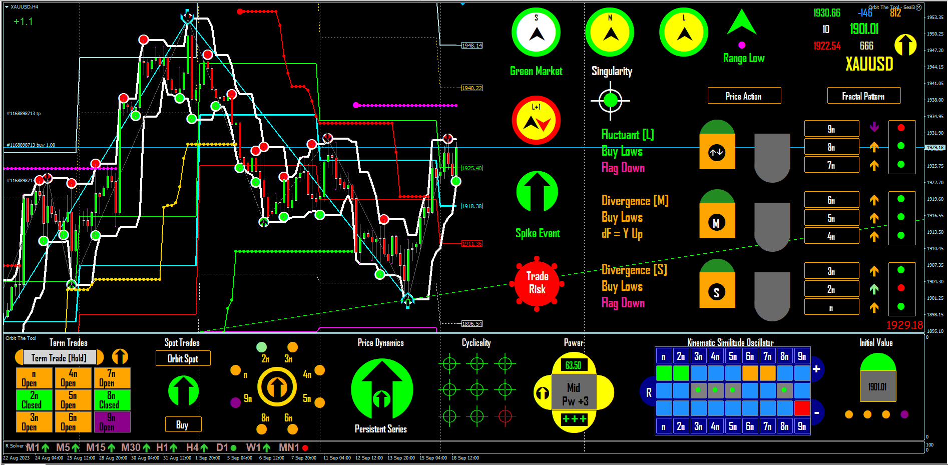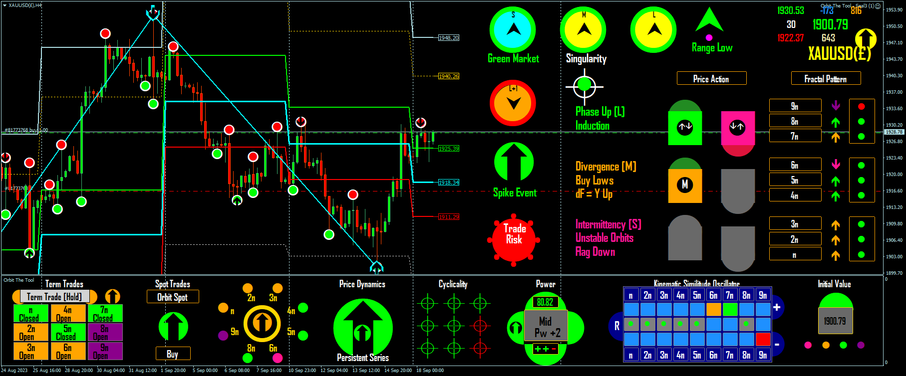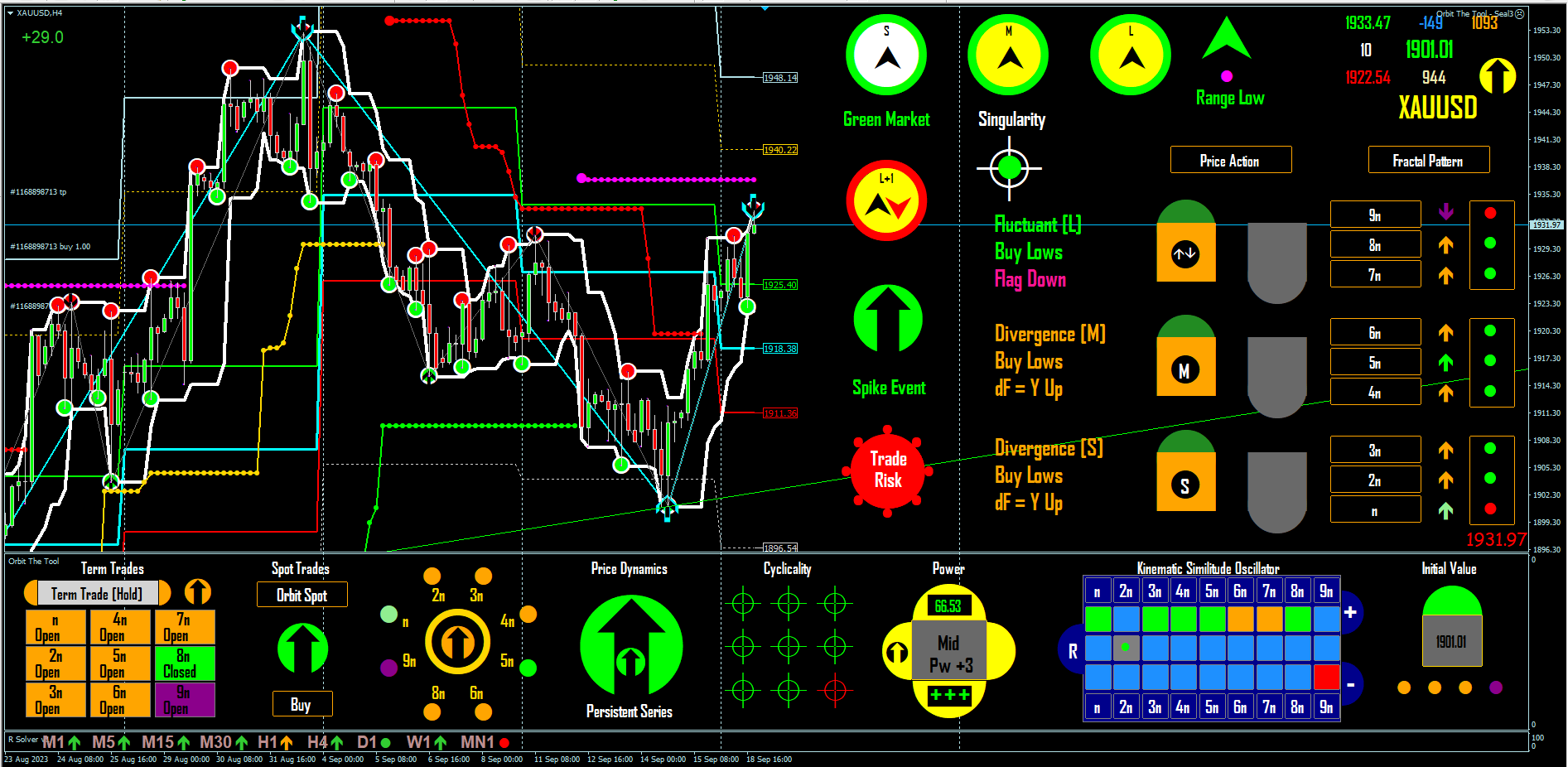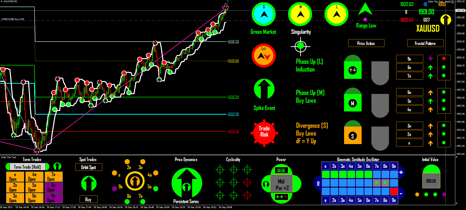 Bought @1931.77 at:<br />1. Range Arrow (RA) and Orbit Spot Arrow match.<br />2. Ordinals S-M-L Green Outline.<br />3. RA, Spot Trades, Price Dynamics, Spike Event Arrows match.<br />4. Term Trade n-7 match orbit arrow.<br />5. Cyclicality 1-7 green.<br />6. KSO+ n-6n green.<br />7. Fractal Patten (circles) green, although Fluctant arrows direction match, colors don't.<br />8. Trade risk circle red.<br />9. Price Action S(Orange), M(Green), L(Green but double arrow). Bought @1931.77 at: