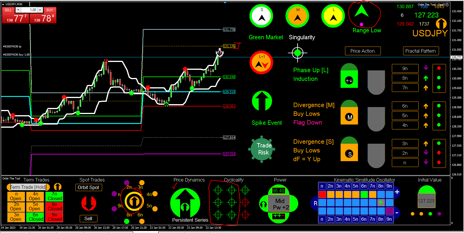 Now it also has to be understood how we breakup time because time is the least accessible variable in trading and the least analysed but not so in fractal geometry indeed just look at the amount of amazing mathematics Mandelbrot unleashed on time in his MMAR model of the market. Mandelbrot shows everyone a key which is that the analysis of time is fundamental to any chaotic model of the market. In our case we are not like Mandelbrot projecting the market by the science but merely reading it by the science and that is a difference, otherwise we submit completely to the master of fractal geometry Mandelbrot.My particular interest in the question of time has to do with the speed of translations and how they change across topologies in specific times. What am I talking about? I am saying that the market shape is never static and moves at all times. Some moves we map may take 12 hours or the whole day going down and just a single bar reversal to recover the last high (called topological transitivity or mixing). To keep things short let me just close by saying we are all freshmen in this business but this thing called chaos theory and its geometry fractal geometry does feel very much like the final solution so please quickly learn to trade only when the risk is zero ---> as Orbit shows.