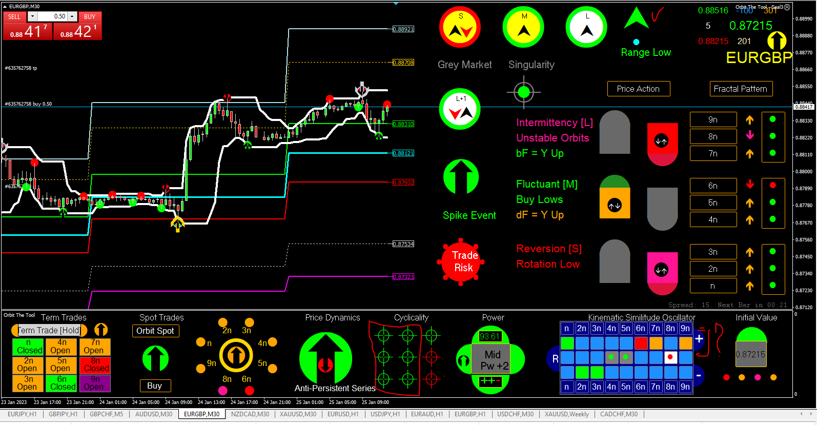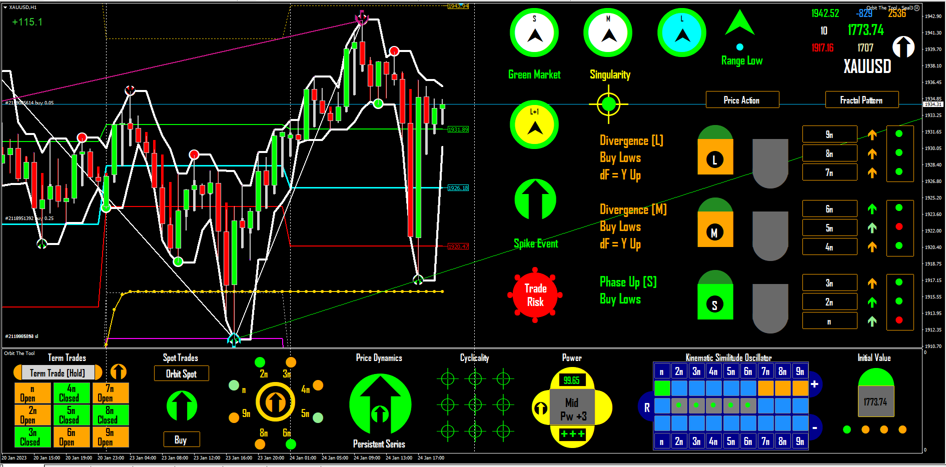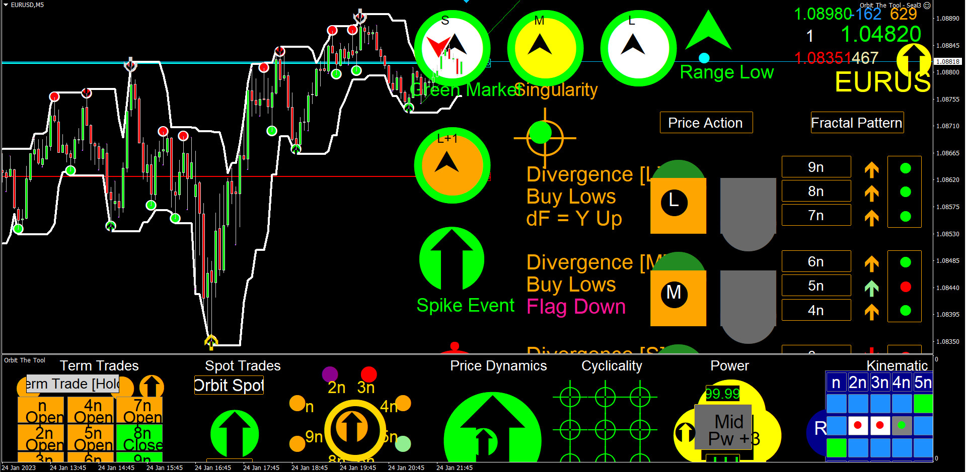 168I do not understand as well what you actually mean. Why do you say it is supposed to buy? Because last point is at a low? If so last point is still moving down and had not stopped at the time the screenshot was taken. Second, we do not use Orbit screens to show trade setup as such because what you are seeing is history and your decision should be based on current information. Only the trader can know exactly what the current information was at the point we are discussing. Third please do not read arrow pointing's as buy/sell -- arrows read different things about the market e.g. whether trading is in range or in trend etc so go to manual study meanings of each arrow and the observe behaviour of model over time so you can understand meanings. It is not an MA crossover reading so it gives more details so do not always assume buy/sell. You need to read the overall context of the fluctuation. You can not understand Orbit in one day so please take some time to observe, read manual and other notes, ask questions about what you read but most especially spend a lot of time to observe the tool and how to make decisions with the tool. Do not base your reading on partial signs. Decision must be based on what the whole screen is telling you not one arrow. Be patient do not hurry to understand because once you understand you will see there are no more problems with trading and winning most of the time.ffsss wrote: Thu Jan 26, 2023 7:31 pm I dont understand, in the first image now is supposed to buy? But arrows and spike event say sell right?