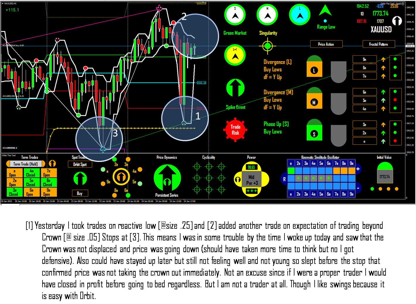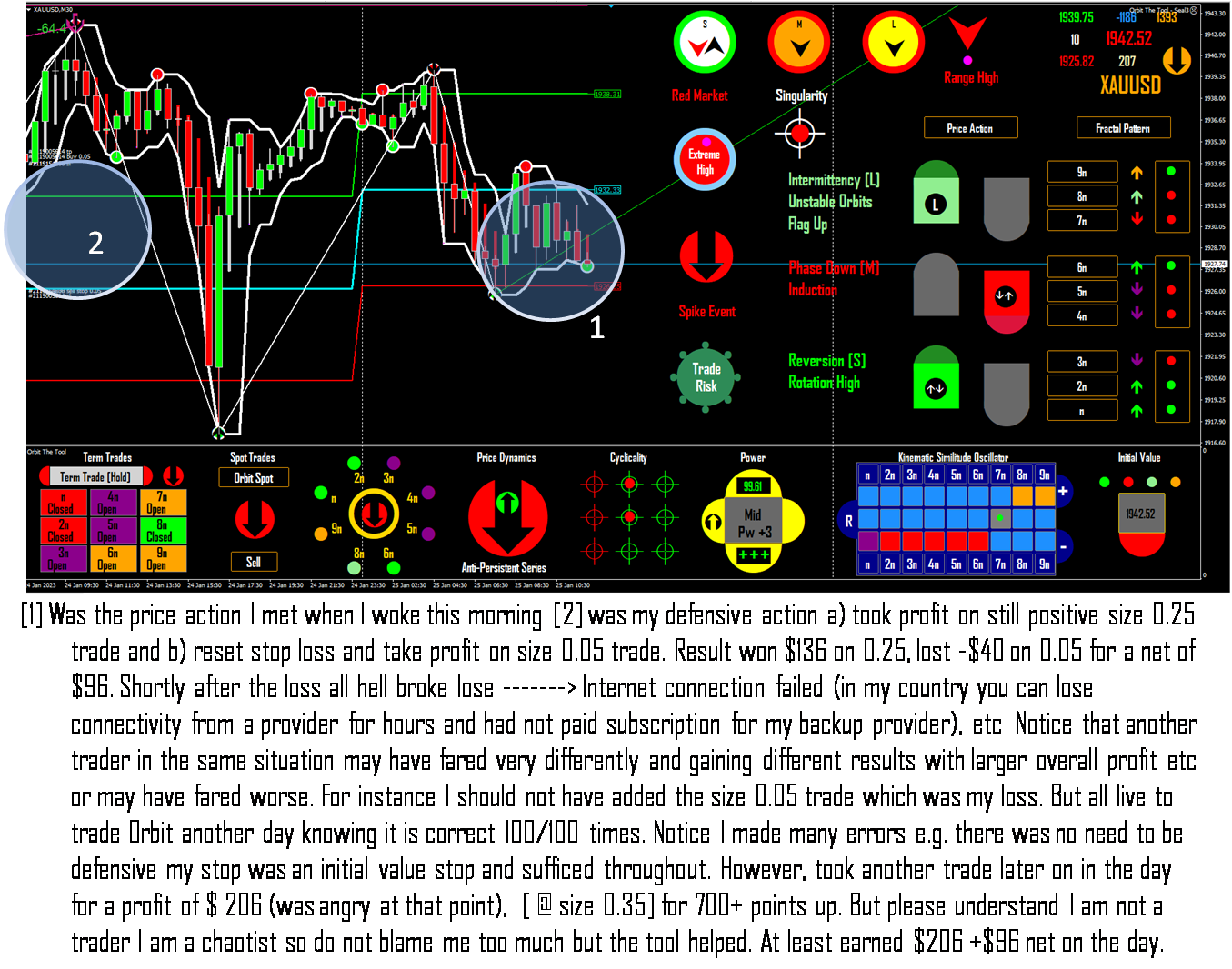 170No kidding -------------> while you were sleeping the market was working (changing), and as you know inflection points are not sign posted in market space (which is why we rely on topological reads). Some people using all sorts of heuristics can be very good at telling approximately turning points, zones or whatever. But from your screenshot price had been coming from quite a long way down (the last Gold Crown low on screen) and the sequence exhausted about where it turned (the sequences we trade are the listings of matched buy sell orders available in range and once this list is exhausted clearly we have a pivot and price must turn as there are no more matches for the matching engines (within the microstructure setup) to publish in direction). I guess this can happen anywhere in fractal space or the so called market strange attractor since we cannot say from the outside without an explicit display of the matched list the range left to go before a sequence of matched orders is exhausted. So it is a dogs life for the trader and the same thing happened to me the night before so this time took out my trade at the point I was able to keep awake watching the move and left and then woke to find what you are talking about in your post. But that is the market for you simply cannot dictate to it rather it dictates to us and we must comply to keep winning - but Orbit as usual timed the changes exactly for those hanging around. Clock time is very hard to manage it is a personal thing. CheersDave111 wrote: Thu Jan 26, 2023 10:50 pm Here is a screenshot I took before going to bed last night of Gold at the start of the new trading day 0:00 GMT.