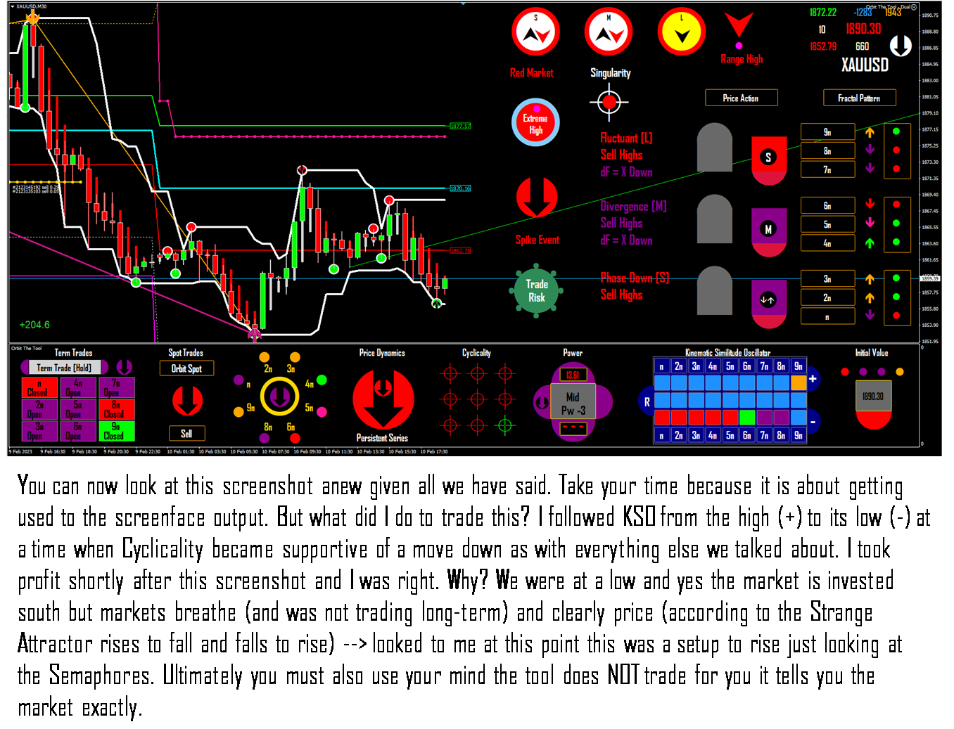 g) The future of Orbit the Tool is in the cloud. Several more modules and greater functionality and communications. MT4 is constraining such in the prototype tool you are trading (for just 1/3 of what Orbit can do see the problems such as hanging, etc). In the cloud version you should be able to call up context diagrams to tell you more about what is going on. A more sophisticated screenface colour divergence-convergence scheme to tell you intuitively how things are shaping, automatic user defined take profit function (very useful in very volatile assets), very early and direct entry and exit calls, music, news feed, etc. But that needs investor input as it costs a hell of a lot $s to make life that simple for the trader and so I am talking to investors who have no sense or imagination of what the hell I am talking about and always focused on the silly question "so how much does this thing make in a month" - IT IS AN EQUATION IT MAKES MONEY ALL THE TIME AND MULTIPLIED BY THE NUMBER OF SUCCESSFUL USER INCOMEs THE AMOUNT MADE IS UNCOUNTABLE - then they go blank. So we keep trading the prototype until I can find investors who understand what the hell I am talking about and so afford to unleash from the cloud. My aim is to change things so that the haunted may now haunt with a license - if God gives me life to that point. One last thing, newbie traders (I think) keep asking for step by step algorithms and ask things like show us how you make your entries, etc but there is nothing like that to show. You are trading an oscillator model which is loop through ambient space each cycle. So you look to trade from the low KSO (-) range to the high (+) tracking a Semaphore move in 6n to gain the scale interval. Looking at cyclicality and the KSO with all the stuff that has been said above you are guided and you practice with the live feed. Thank you,