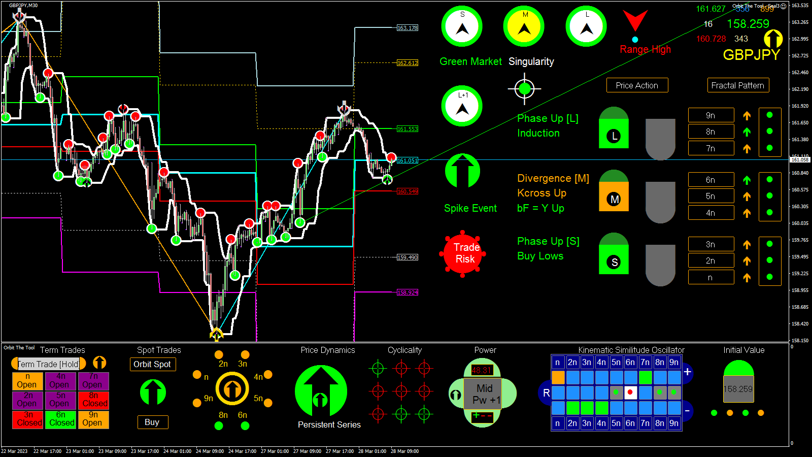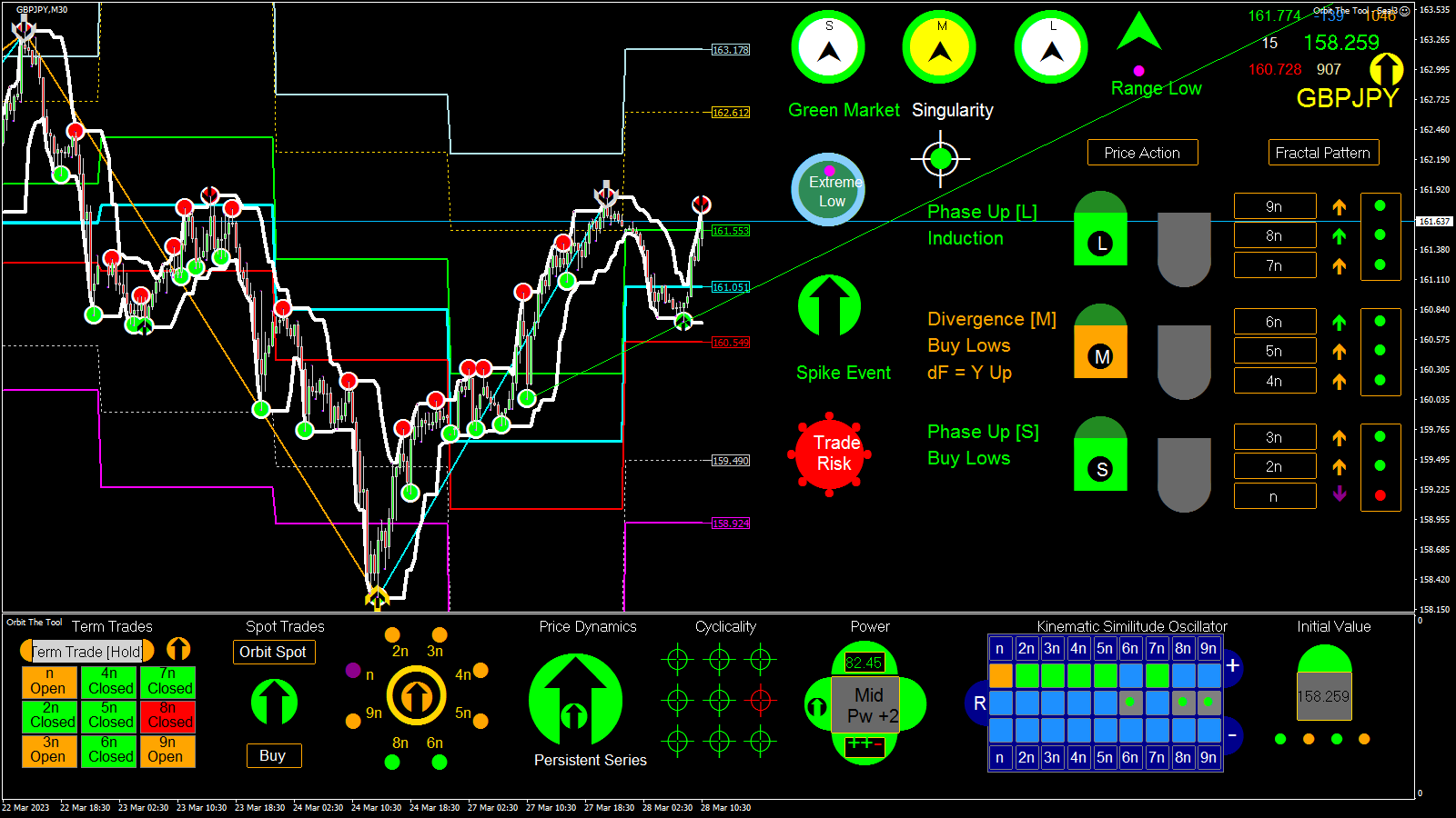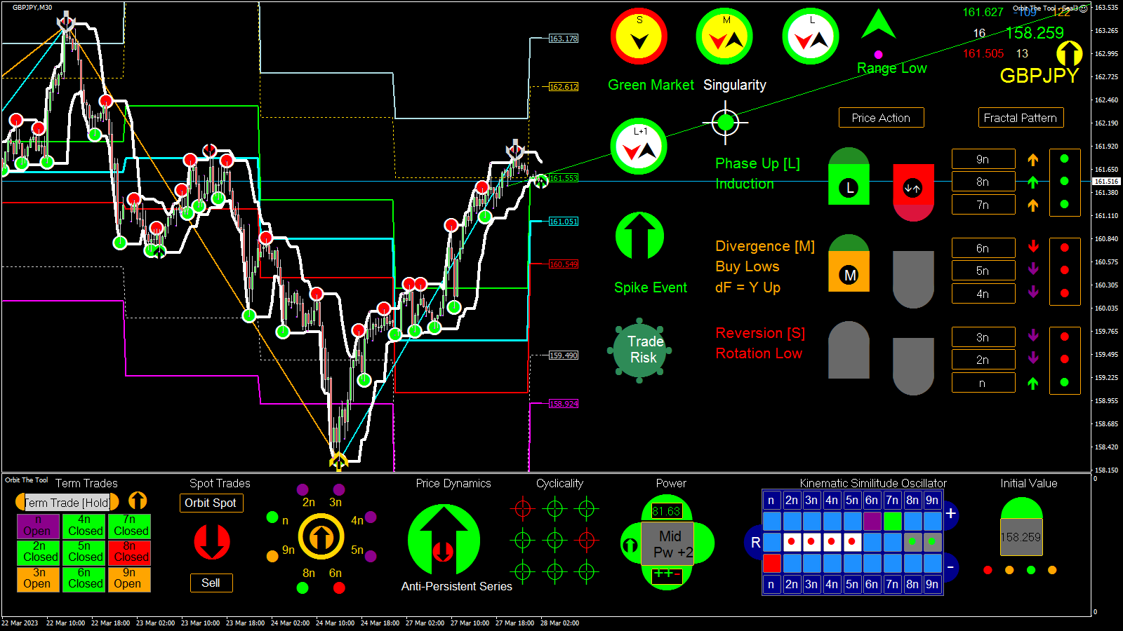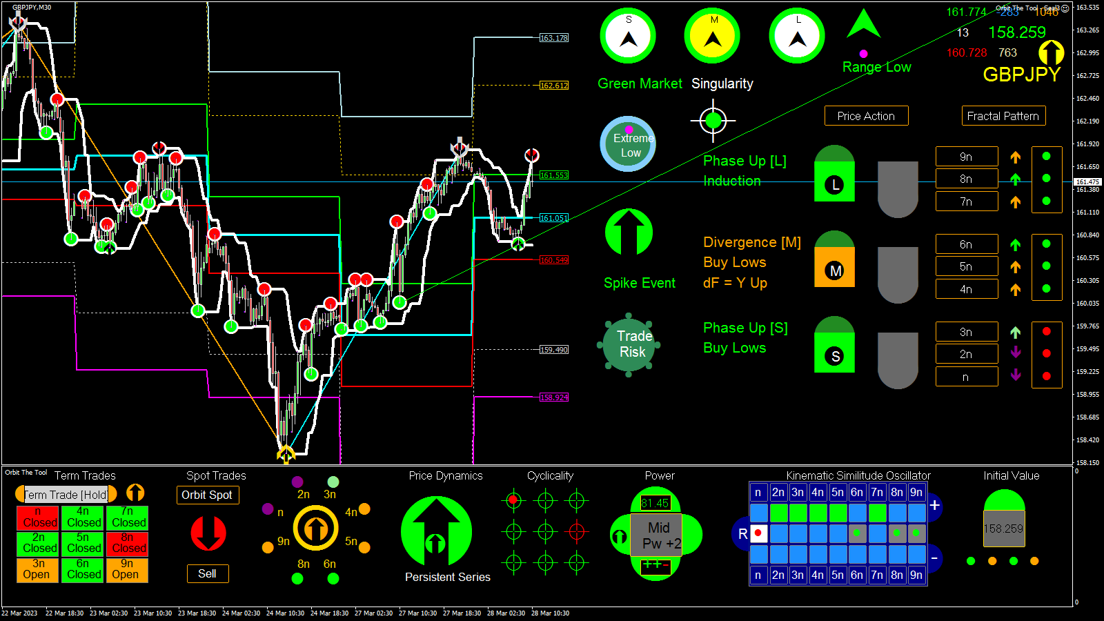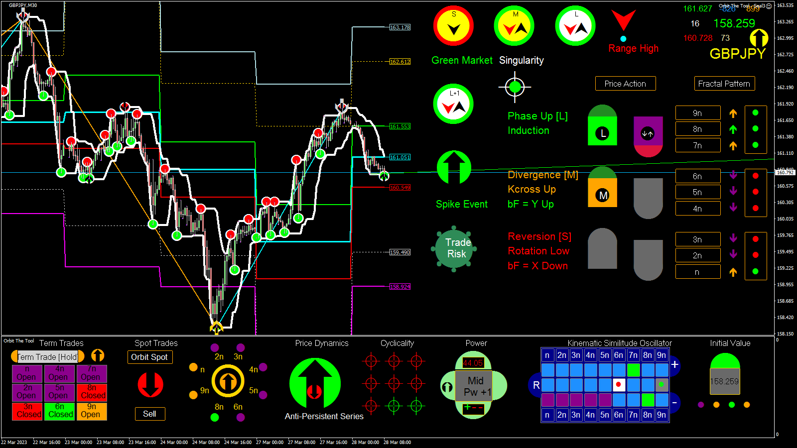 Sorry been away for a bit --- which from the interactions I now see is not altogether a bad thing as everyone has felt free to express themselves. No one of course is right or wrong but from what I have read I think I am going to have to respond in a major way this weekend. This tool is supposed to be simplest and most profitable tool to trade both for experts and newbies. Indeed, the worst trader should be able to make 200 - 500$ per week by trading Orbit. However, it does appear that much is clouded about how to interface and use the readings of the tool and I will act to clear everything up. But before that time let me clear up a few points "technical" indicators such as MA's and Oscillators, etc carry zero information about the now and the future. They have their uses but they cannot tell you information about the right now and the future and are in a sense dangerous and the reliance on them and ideas about them (mostly baseless), is a source of much grief to those who depend on them. In Orbit they are handled such that they do not have such side effects since they are not applied directly to any indication but are related to the most important and critical indicator ever in trading the Chaos Semaphore. Think about it this way, If price is at an extreme point and turns down a) we do not know a lot about its future b) Our action or actions responding to the said turn is critical to profitability and especially on a consistent basis. Most indicators are slaves and will simply tell you price has turned down. But the pattern of pivoting tells you about the now and therefore the future. For instance, in my example, if there is further upside, a system of stops will occur say lower than the given high point (across the feed), the firmness of which tells you continuation or otherwise. The point I make in a hurry is that the market is fractured (dynamically broken up), and therefore the nested system of pivots or fractal primitives describe its state and structure at any point in time more exactly than Slave tools driven by heavily smoothed values coming off of so-called "technical" heuristics which are largely untreated (even incorrectly treated), for the drag this generates in chaotic space. Semaphores (i.e. the system of stops which they report), however, provide up to date information and in the time within which a trader can make profitable decisions. The MACD or other "technical" indicators therefore lag the system of pivots in the information they provide and are completely blind to the more critical information Semaphores actually provide when milked for such (apart from the fact they, especially MA's provide only partial information one side at a time and MA's and the others miss some of the information Chaos Stops or pattern provide). So the Rsi, MACD, MA's, etc rather belatedly correct to the information provided by the system of Chaos Semaphores constructed for an application and only partially (there are obviously several ways people have applied them but in Orbit they read chaotic fluctuations strictly and follow a specific pattern which expresses the equation underpinning the market). Making this fact clearer for all to see should set us all on a better path to reading the tool more effectively and with the required confidence. So lets wait to see what I can do to help. Another point I would like to bring up is that nothing "lags" in the Orbit setup -------> because of the way things are related. But yes it therefore implies that there is a way to look at things setup in that way. Again lets see how the weekend goes. Cheers everyone.