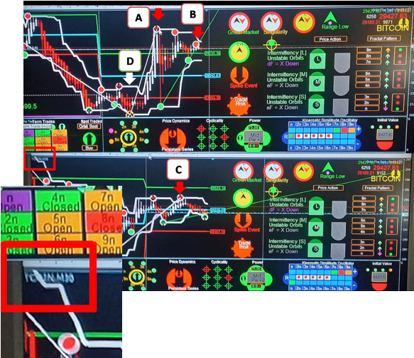 However, look at the 6n (top snap), bottom left at D (green/white arrow), and observe we have a Gold crown. Which suggests that if the next stop does not displace that point lower (unlikely), then at the expected match in (4) above price MUST rotate higher to X = Y or a 6n Gold Crown @ high.