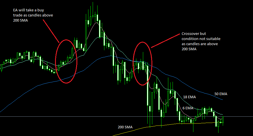 • EA will trade when there is a crossover of Fast EMA over the Slow EMA.