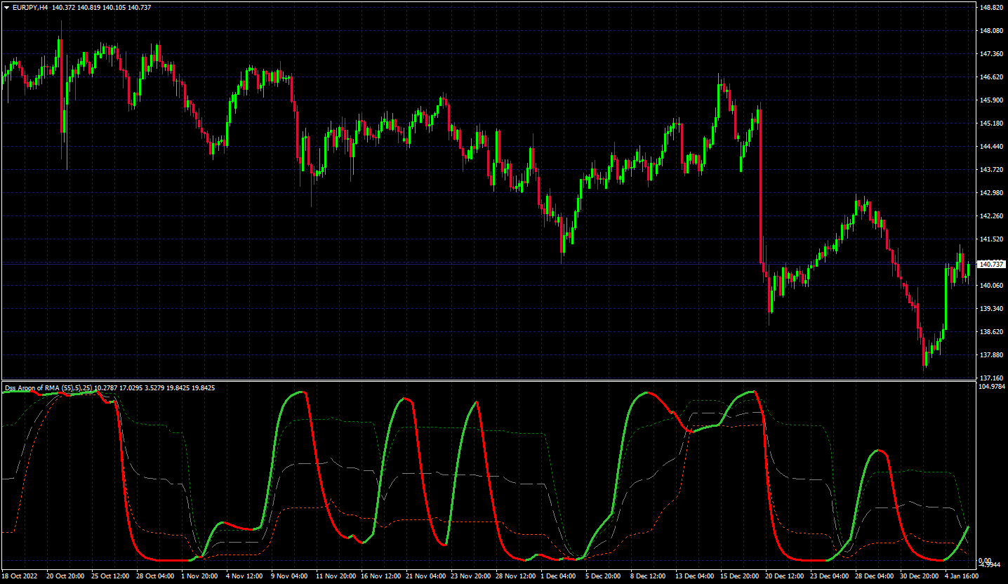 The Aroon indicator was developed by Tushar Chande in 1995. Arron oscillator is belonging to the same family and is (even if it does not look so at the first glance) a direct offspring of Aroon indicator.