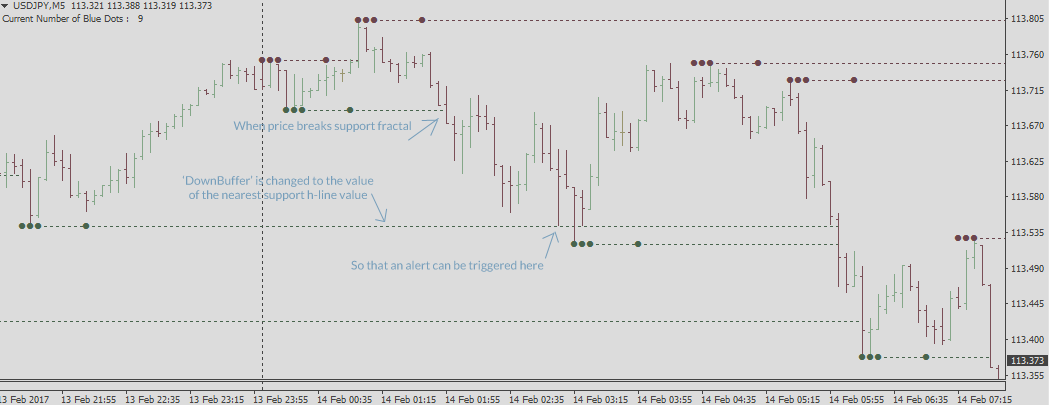 I am wondering about the feasibility of adding alerts to a free MTF Fractals indicator from TrueTL. Most fractal indicators I have encountered will only alert price breaks of the current support and resistances fractals. If the fractals are not broke they disappear once new fractals are formed. However, I would like to have alerts for when price touches any of the previous 'unbroken' fractals too like the picture below.