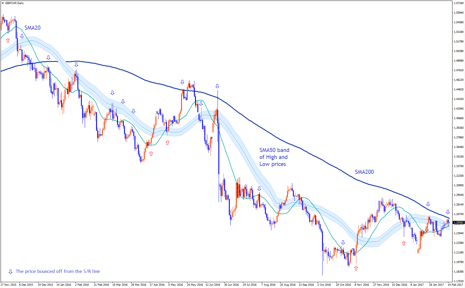 Moving averages can be used in different manners. As slope, as crossing signal with another MA and/or as dynamic S/R. The latter may be much less known, but as static S/R it is a pretty powerful PA analysis tool as well. It's a indicator, that's the good news - we don't need to draw them manually. But low-pass-filters EMA or SMA aren't use here in a indi-typical way, but as boundaries where the price bounces back, e.g. back in the trend direction. EMA weights newer samples or bars much more than older ones. That's why it is use intraday, where the market reacts more to PA. SMA doesn't weight the bars and is mostly favored by daytraders. On these tfs the fundamental analysis has a big influence.