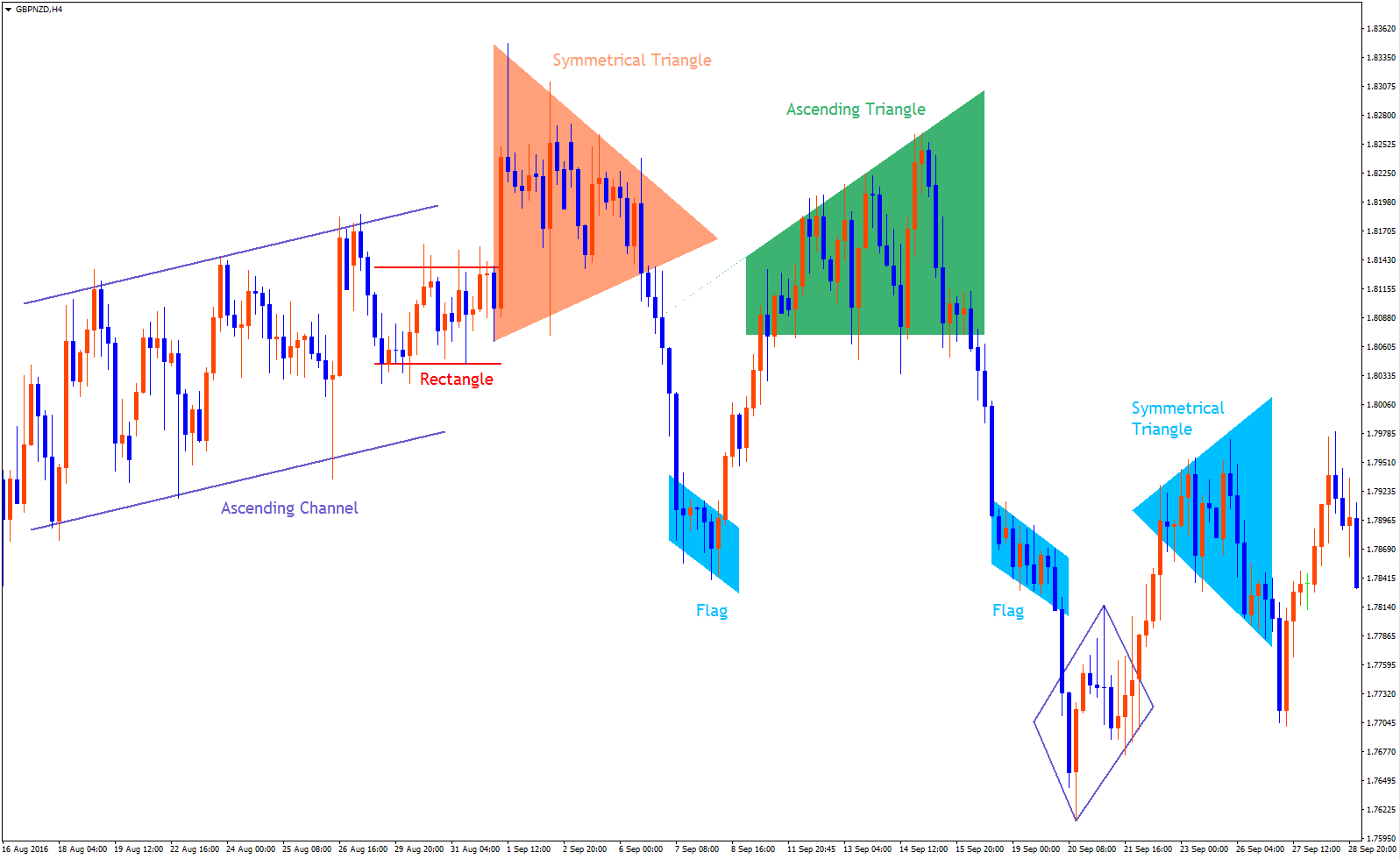 Channels are often part of the trend and can be spotted easily. You can either trade the bounces (fake brakeouts) from the bottom or the ceiling or you wait for real breakouts. Triangles aren't that easy to identify while the market builds them. At least you can trade breakouts. But patience, you have to wait till the current candle closes inside or outside the fighting zone. The longer the pattern take, the bigger the following impulse, but don't be confused if the price retests the broken TL from outside.