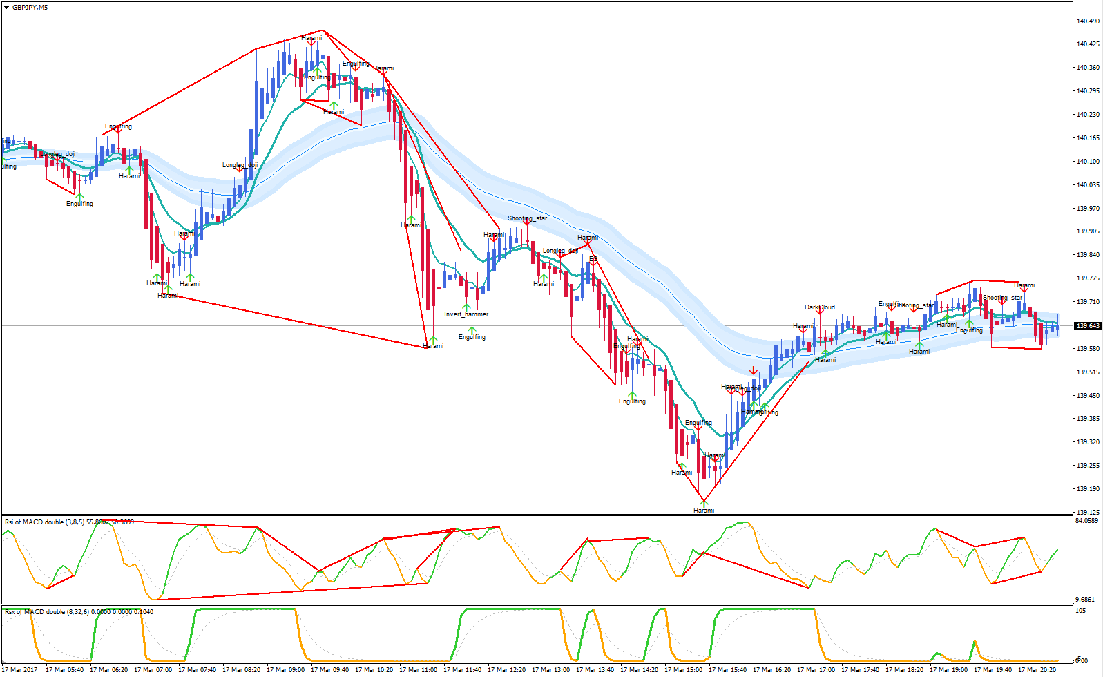 The following pic is a scalping setup. When the odds are in your favor, here JCS and divergences, go in. Trend continuation patterns with the original rules or changed to more aggressive. You also can take the reversal/retracement patterns, but this is a bit more risky. I'm fan of the RSI of MACD double.