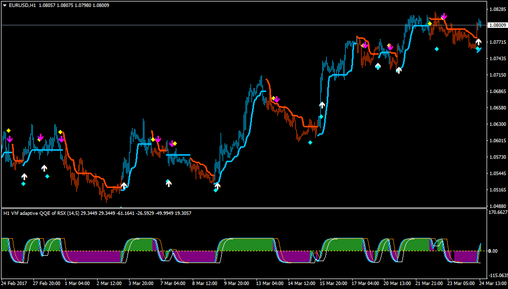 It is "QQE (vhf adaptive) dynamic zones histo + arrows + alerts"