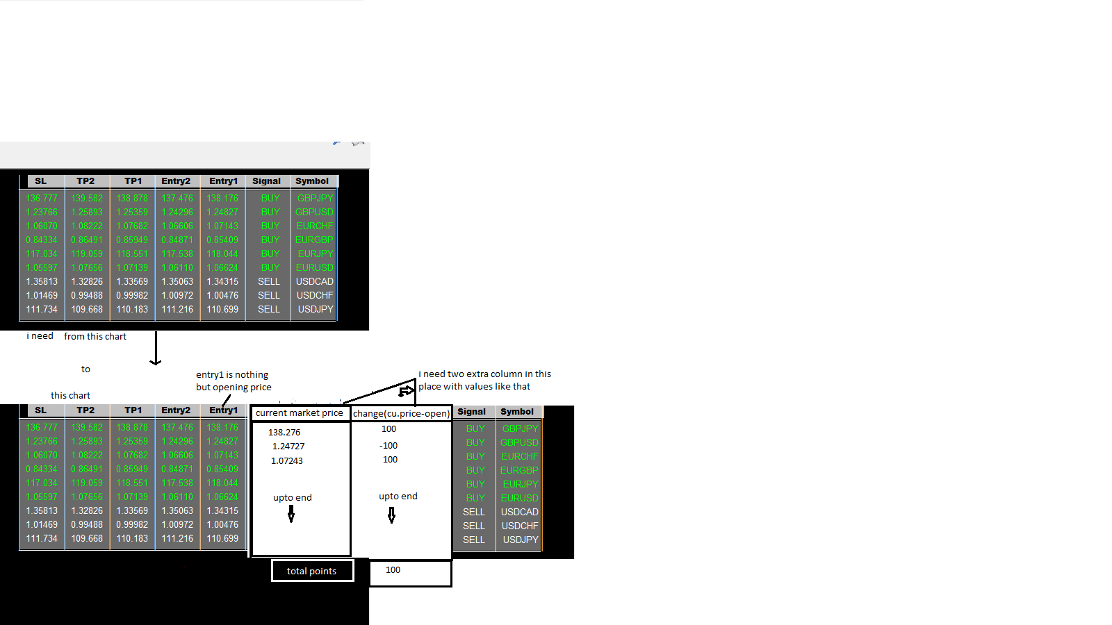 i need help to modification the indicator which i posted here. the indicator name is "forex dream time dashboard". this indicator gives 9 pairs signal at daily opening time. it gives entry1, entry2, tp1,tp2, and sl levels. here "entry 1" is nothing but " daily open price". and i need two more extra column between entry1 and signal. those like 1 . current market price 2. change points(current market price - open price) 3. and the bottom under "change points" column i need "total change points" according to "buy sell signal" only (+ or -) Â . Â not according to open price. i posted the picture for example. and i attached the indicator also. i am not a coder. please help me to modify this indicator.