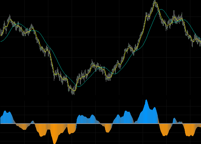 DWMA (double weighted moving average) is ideal for the slower line as is tends to delay reversing direction until JMA crosses it.Note where JMA (yellow) crosses DWMA (cyan). The full-color oscillator underneath measure the difference between JMA and DWMA.