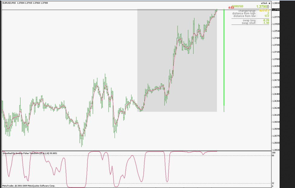 MLADEN : Now the smoothed RSI " Inverse Fisher Transform" with a difference that it uses the improved Rainbow WMA (i decided to call it that way since i think that it is much better name and having in mind who actually found that way of calculating ... ) the rest is the same - in short it is an Ehlers" inverse fisher transform of a zero lag smoothed RSI of a rainbow wma (interesting definition,is not it