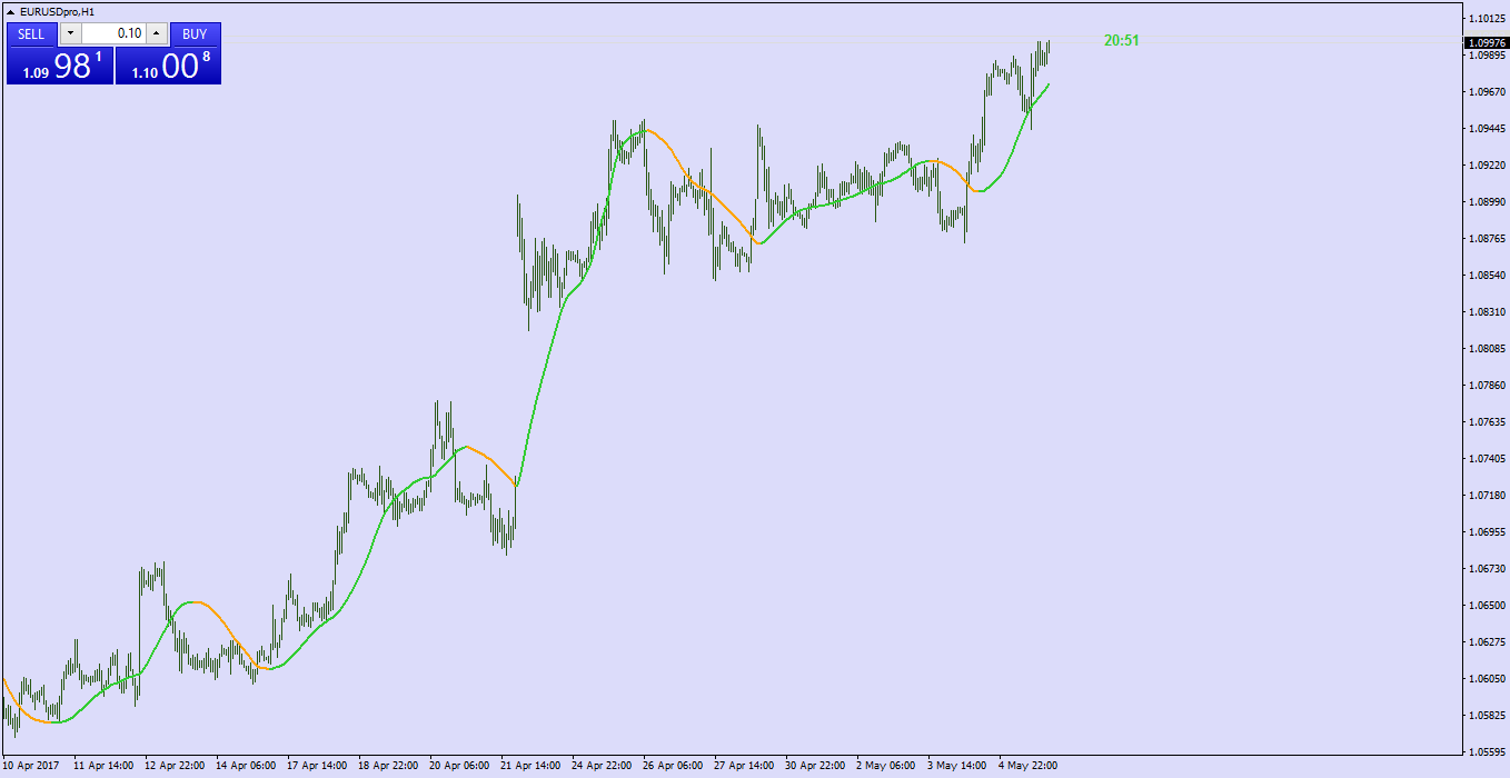 T3 indicator using standard deviation for adapting (T3 is very good for adapting, since its calculating length does not need to be an integer - for example you can calculate a nnn.5 T3 - and that gives a perfectly smooth T3 value even when adapting is applied to it which is not a case with some other averages types adapting)