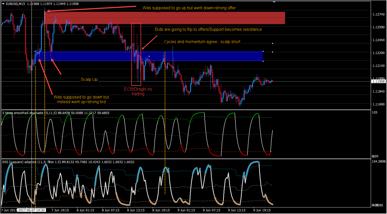 To identify S/R or S/D zones I look in the past - if cyclical stochastics said down but price went up then there are strong bids there so I can scalp the bounce or if price should break through - bids will flip to offers and support will become resistance.