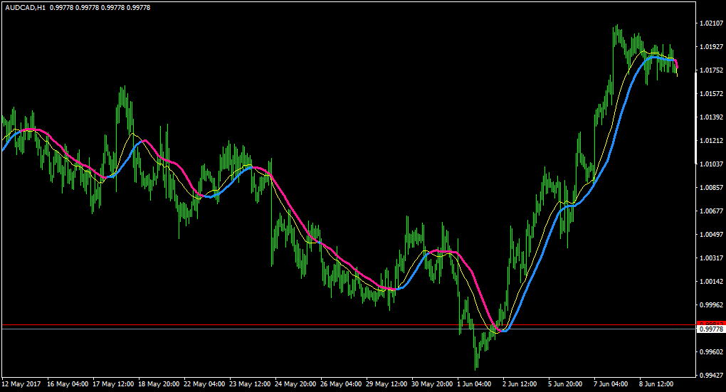 It is not a single Average but rather a correlation of two averages , one being a regular average and the other is and average of highest high and lowest low,their crosses are showing the current "trend" - used the default parameters proposed by Vitali Apirin.