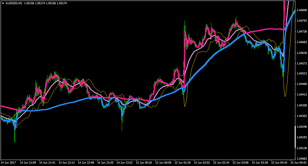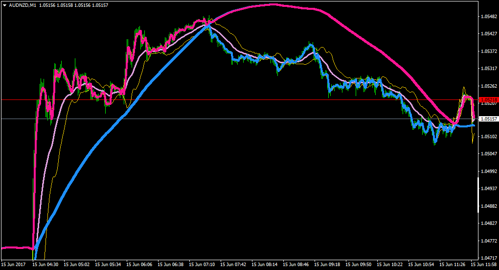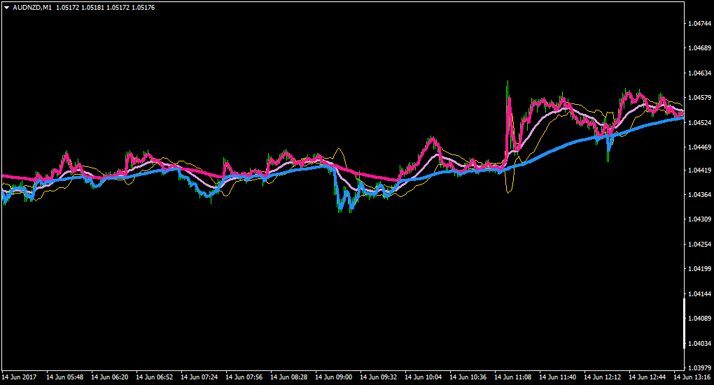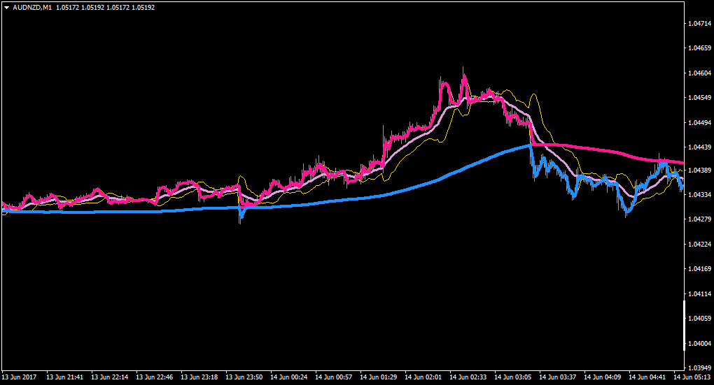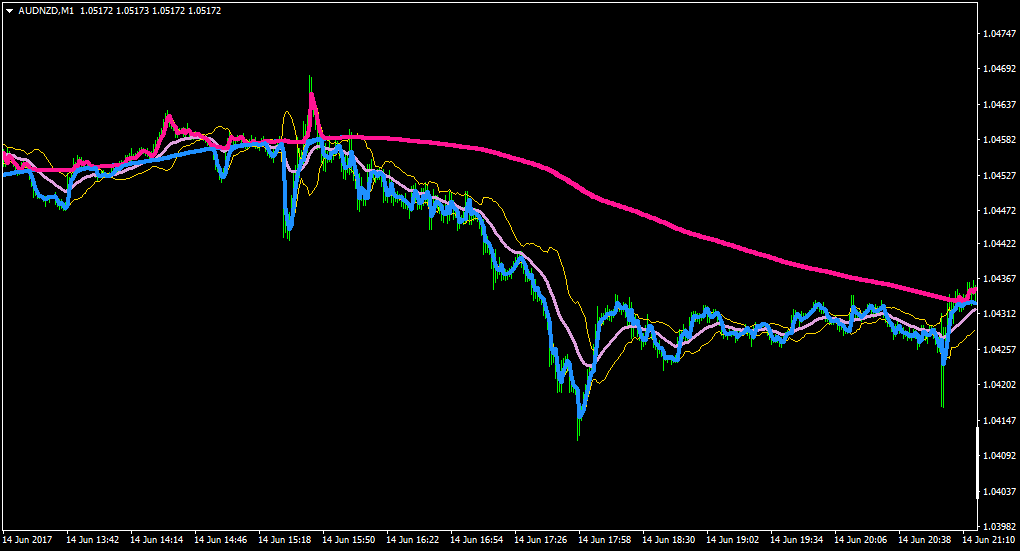 i adjusted all two indicators within price line - one with short periods,means fast the second with a bit higher periods ,slow one - interesting part one band all time rides on price - the pictures are from 13 june to up till now with M1 TF