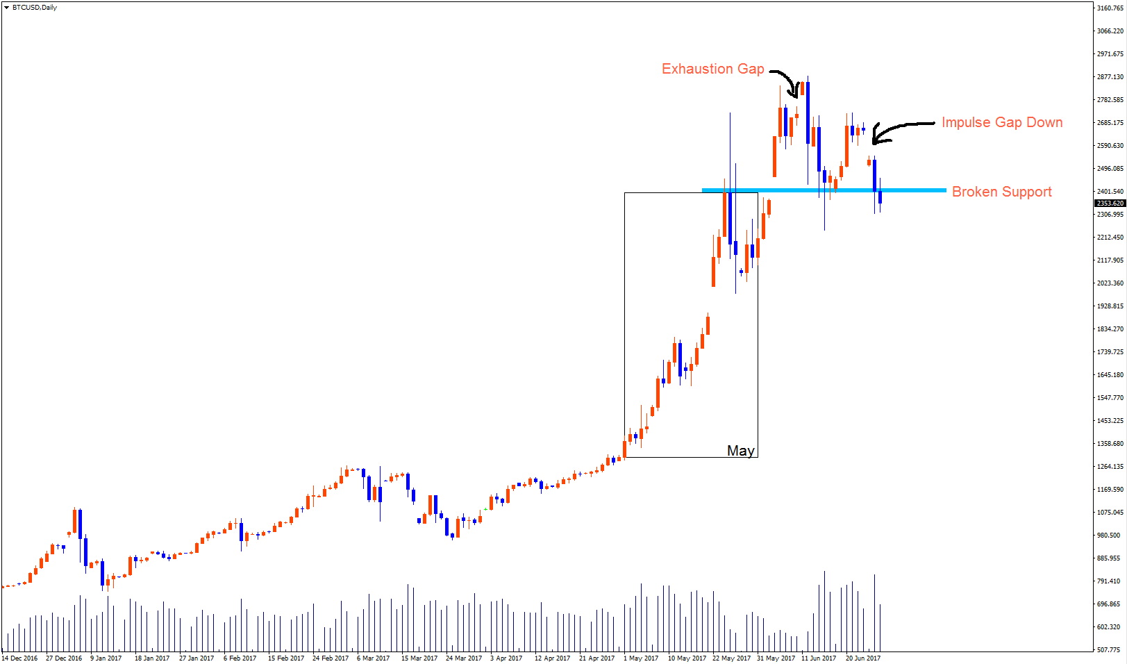 It is hopeless over-hyped, there were no sellers anymore - only buyers - so the only way the hype-train can go is down - after you were a buyer, you're a seller. See the exhaustion gap. It's a good sign of weakness. The Impulse gap that followed this weekend should let ring your alarm bell. It's still struggling now a bit, but Buying in isn't a good idea right now. The picture is getting a bit clearer when you take a look on another crypto-currency, the ETHUSD (LTCUSD even looks worse).