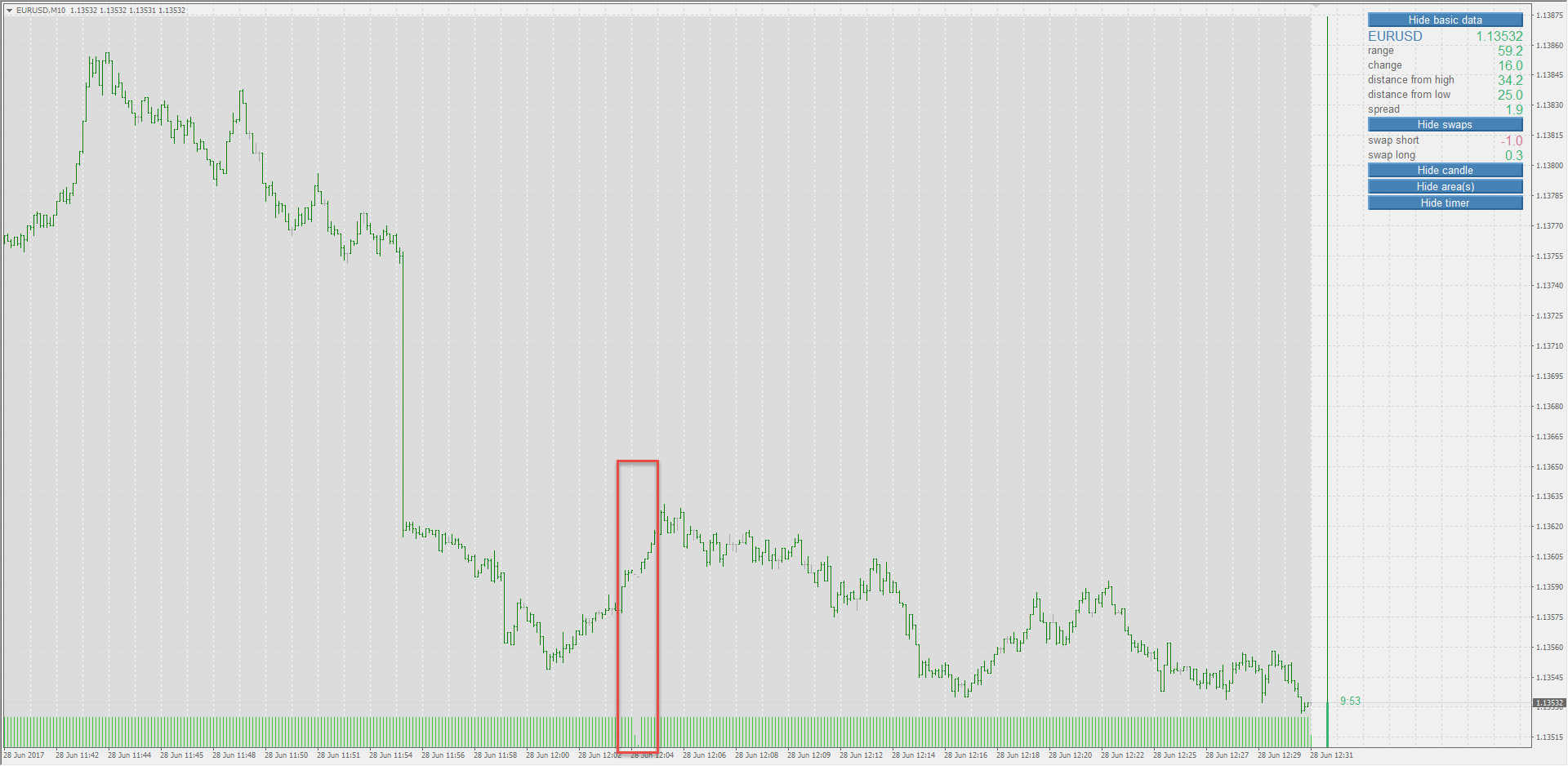 Do one more thing : set the volumes to be visible on chart and see if it happens the same as on my exampleKrelian99 wrote: Wed Jun 28, 2017 7:13 pm I let it run on demo account since I trade with cTrader and switched to my real account (copied the hst-file too) and there is a really huge peak now (4x bigger than the others). Seems to be some connection problem. There are no error messages. I mean the attached indis take the Close for their calcs and cumulative delta isn't concerned as well. It's a bit annoying maculature but I can live with it.