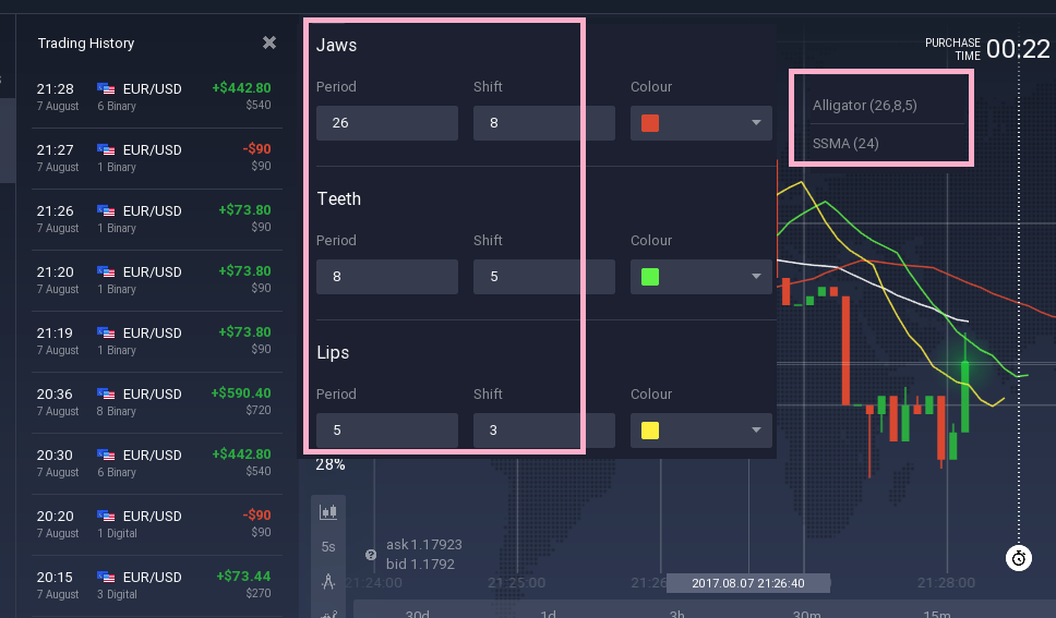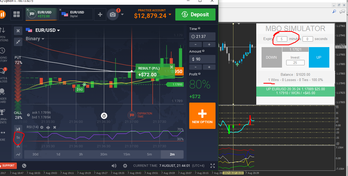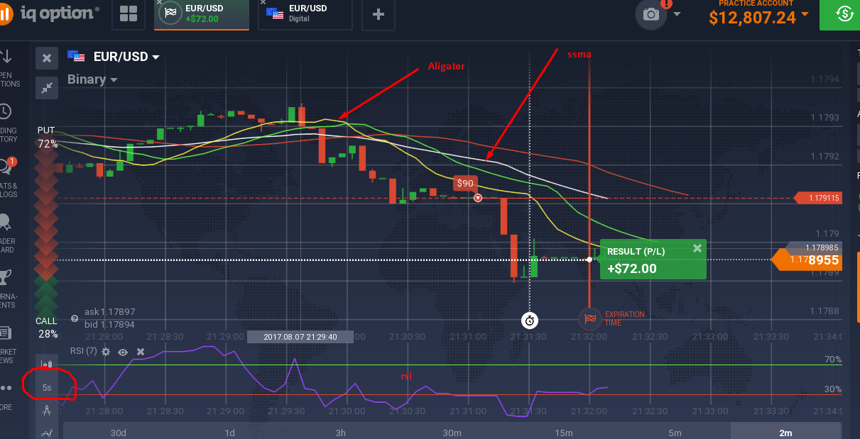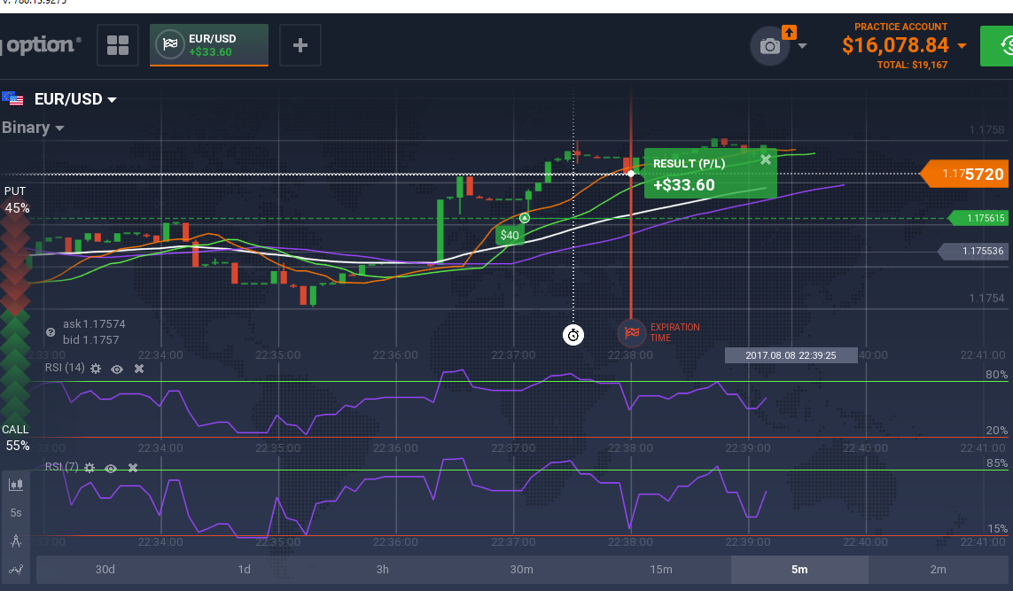 i use in my broker demo and indicator with stratgey with 5 sec bar and expiry 2min get stong signal and win rates. within 2 day i tested and ear about 6K$ ...