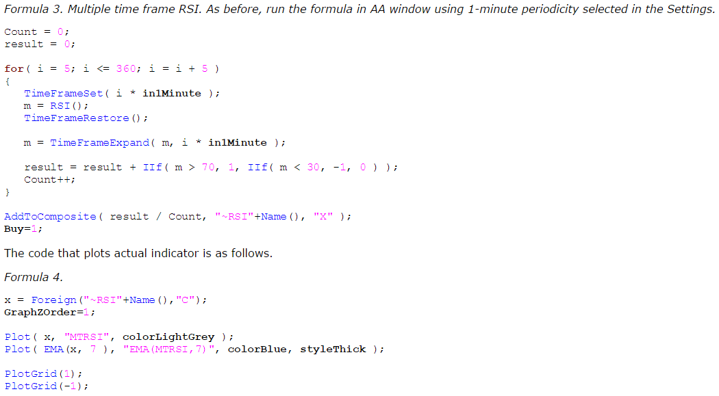 In second example we will present an indicator that could be called “extreme overbought/oversell” indicator. It’s construction we will use RSI indicator to detect overbuy/oversell conditions occuring in different time frames. Overbuy signal will be generated when 14 bar RSI is above 70 and oversell will be generated when RSI is below 30. INnthe second step we will generate RSIs in every interval starting from 5 minute, through 10-, 15-, 20-, 25-, 30, 35- minute interval up to 360 minutes.
