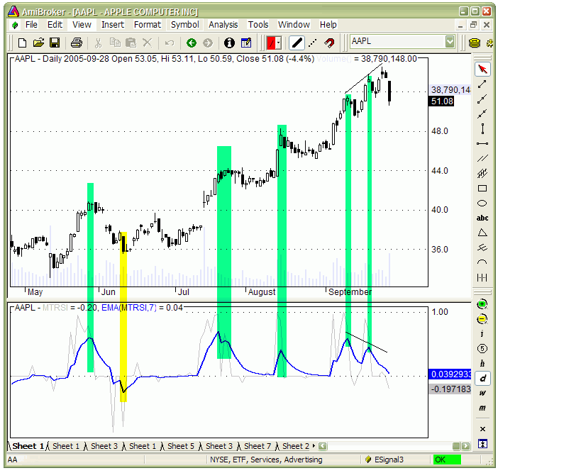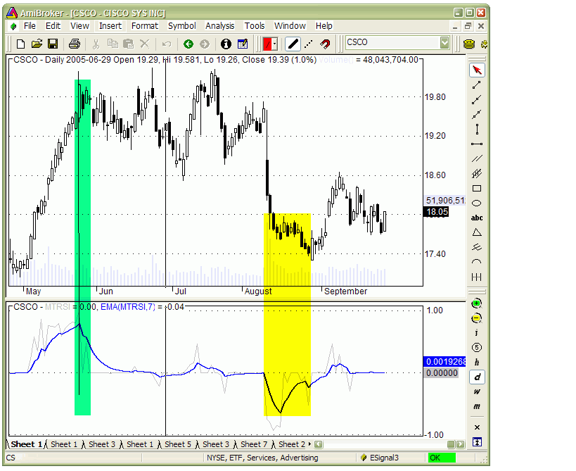 In the figure above we can see daily chart of CSCO plus extreme overbuy/oversell (light gray) and its 7 day moving average (blue). As we can see from the chart smoothed MTRSI peaks and troughs precisely show ends of large up trend and down trend moves. One stunning feature of this indicator is clarity of trend-ending signals. This indicator is perfect for timing the exits. As many researches have shown good exit timing is often more important than entry timing. In this figure above you can see another example of MTRSI with very clear signals of local maximums during the trend. Even more stunning is the divergence that develops in the middle of September when prices continue to rise and MTRSI makes two peaks in clear downtrend. These leading signals helped to get out of trade just at the very end of very nice up trend.