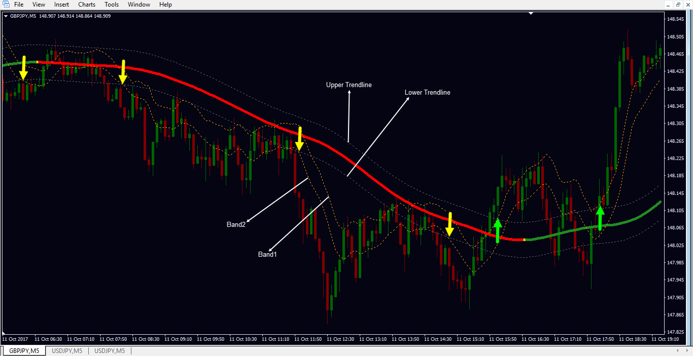 Can you please help me add down arrows and alert when Band2 crosses Lower Trendline, and Up arrows when Band1 crosses Upper Trendline as illustrated in the attached image.