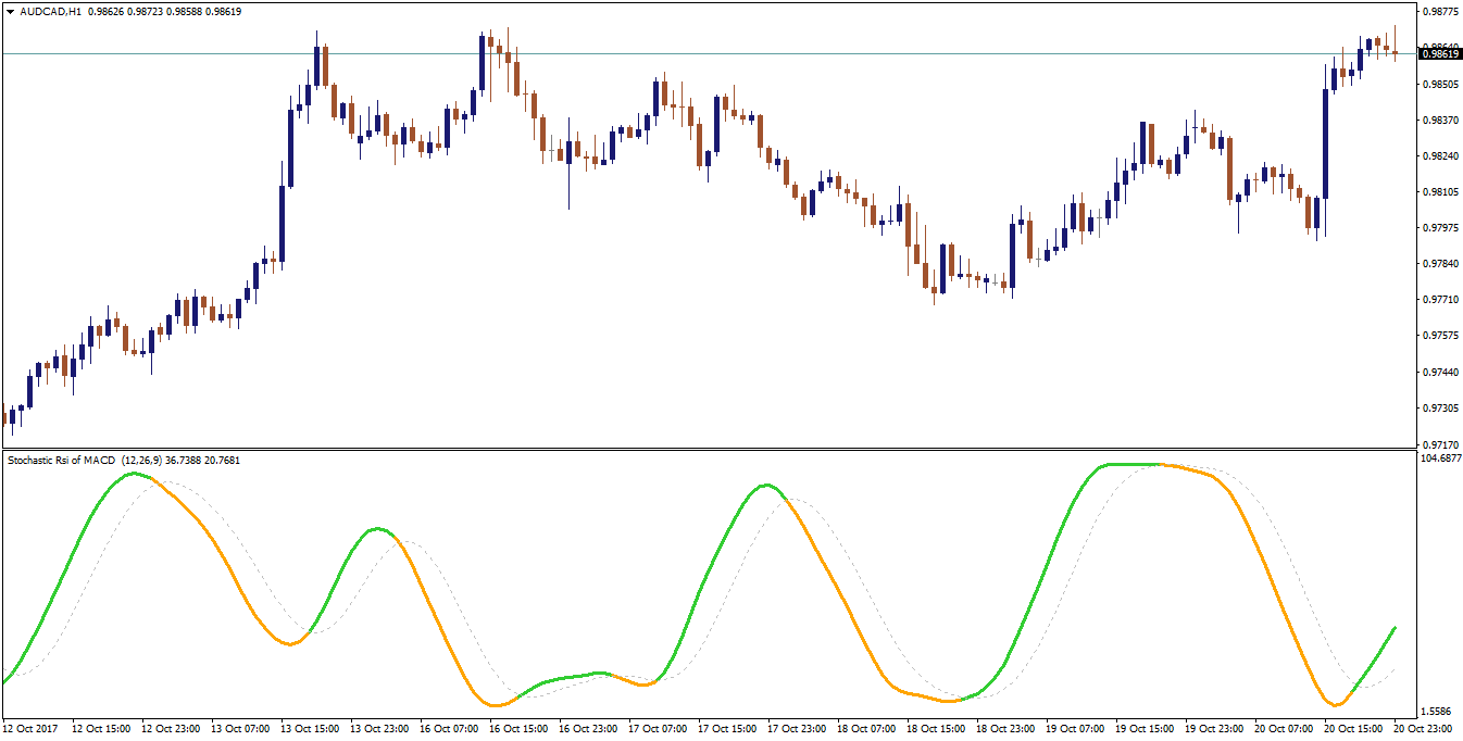 This is a stochastic of rsi macd double. For the rsi you have 6 rsi type options ,Regular Rsi,Slow Rsi,Rapid Rsi,Harris Rsi,Rsx, or Cuttlers Rsi, for the macd options you have 8 different ma type options, Simple moving average,Exponential moving average,Smoothed MA,Linear weighted MA,Smoothed LWMA,Double Smoothed Exponential average,Triple exponential moving average - TEMA, or Linear regression . Also the macd has the 30+ price options.For colors there is color on slope or on signal cross.