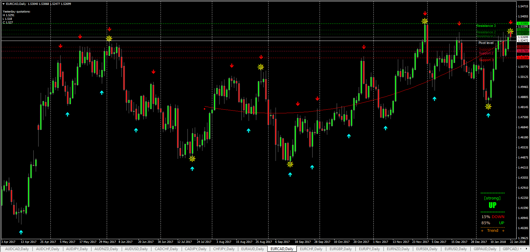 I have attached two pictures of the EURCAD to show you what I mean by the arrows moving to the next candle. That is a problem but so far I have not seen them repaint from a sell to a buy or from a buy to a sell.