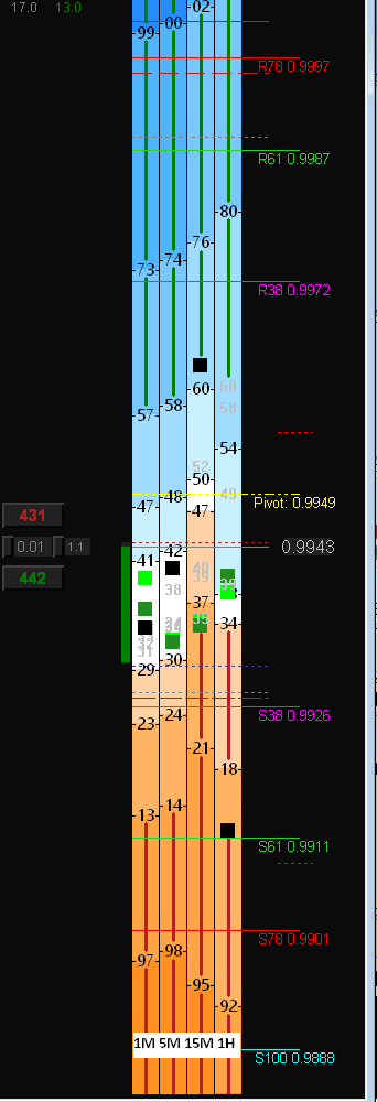 The grid is a 2D representation of each time frame chart laid side by side. Each box (dark green, light green, dark red or red) represents a leading moving average (13 SMA - light green or light red and the 21 SMA as red and dark red) the 233 SMA is colored as a black box. As price crosses the moving averages it crosses the grid boxes and they are either green if price is above the MA or red if price is below the MA. As price moves either up or down and is trending it will cross the shaded blue or orange areas marked by the dark black numbers, if the time frame is trending up it will go into the blue zones or down into the orange zones, this makes it easy to tell what the market is doing on each time frame. Daily fibonacci pivots are added as well but these can be changed according to your trading plan.