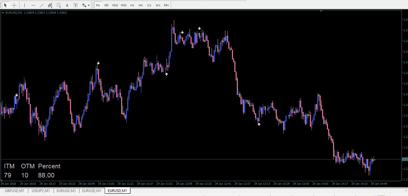 PUT - with the appearance of white down arrow (purchase immediately). Expiry before the end of the candle (for M5 – 5 minutes, for M15 – 15 minutes and so on).