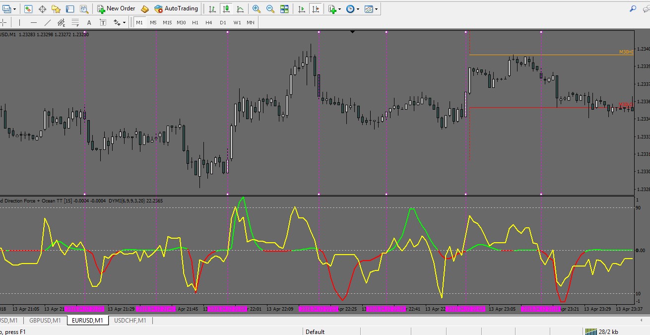 arrow will appear once DYMI line (yellow) and TRENDFORCE (red/green) cross at zero level. Arrow paint based on the trend force slope confrimed (green/red)