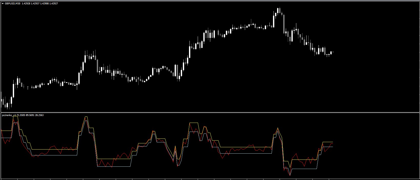 if red line (pcci) is crossing the yellow line (upper renko line) to above - signal for buy;
