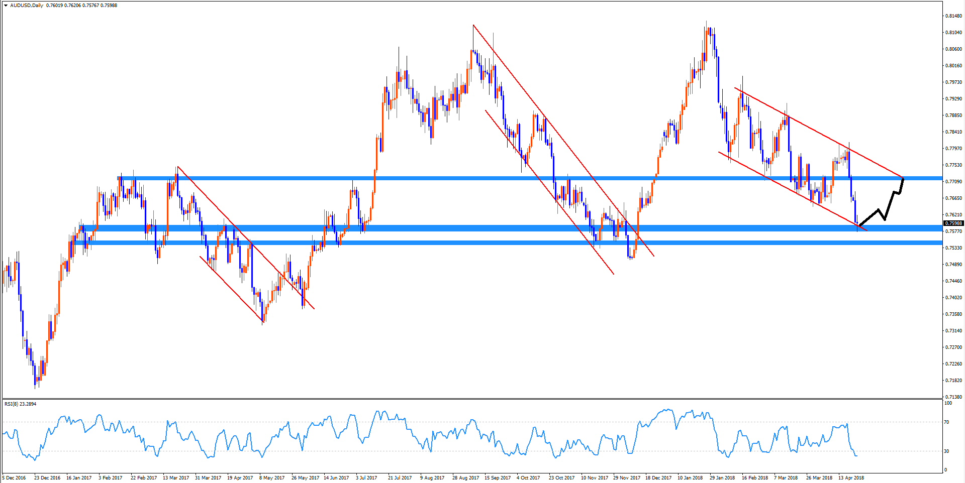 The first chart is the AUDUSD D1 which is situated at the lower channel boundary and at a support. The support below is very strong. I see RSI below 30. A Buy back till the upper channel boundary is the most likely scenario at the moment.