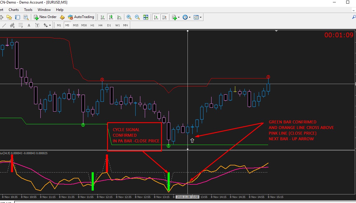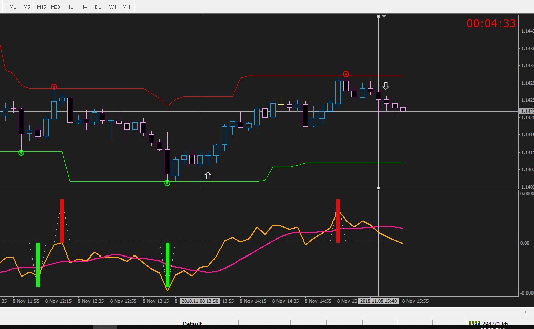 valid open trade in 1st crossing up signal after green/red bar appear in sub window at close price.