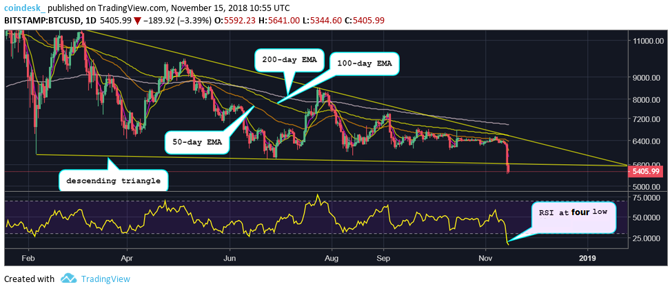 Daily chart BTC closed at $5,595 yesterday, confirming a downside break of a nine-month-long descending triangle.