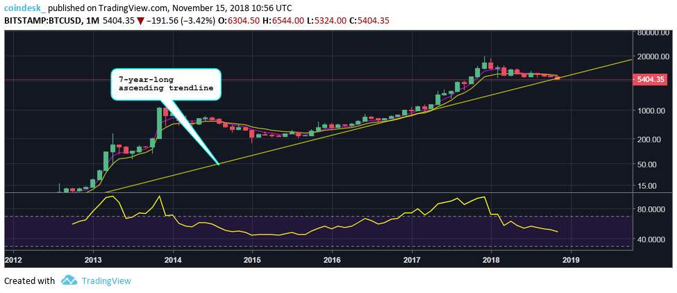 Monthly chart Over on the monthly chart, BTC is trading below the support of the trendline connecting the November 2011 and August 2016 lows, validating the bearish view put forward by the bearish crossover between the 5- and 10-month EMAs in September.