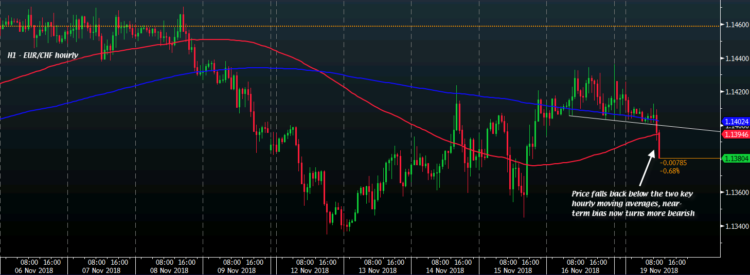 As a result, EUR/CHF has now fallen back below the 100-hour MA (red line) and now sellers are in control as near-term bias turns more bearish. Price action is a little choppy today but the downside break here will at least give sellers some incentive to test the swing region support near 1.1360 in the near-term.