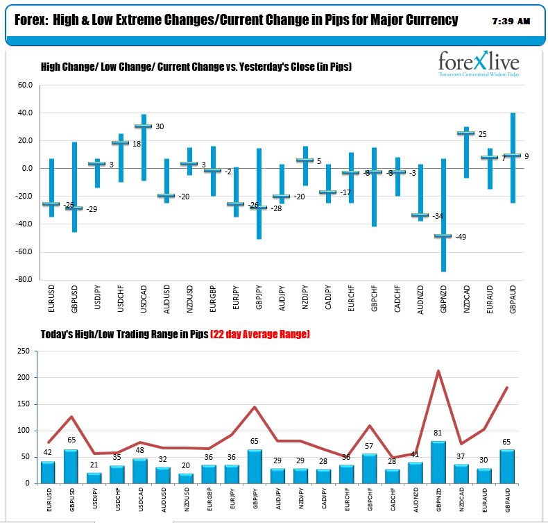 The ranges and changes are minimal (see chart below). Against the USD, the GBPUSD has the largest trading range at 65 pips. That is still well below its 22 day average of 127 pips. All the other pairs have ranges less than 48 pips (USDJPY has only traded in a 21 pip range and the NZDUSD only in a 20 pip range). The major cross currency pairs - including the often more volatile JPY crosses - are also well contained. With the weekend risk from the G20, it is not surprising that the markets are not moving much. However, there can be bouts of squaring up before the close that could solicit market reactions today and any comments will be scrutinized as well.