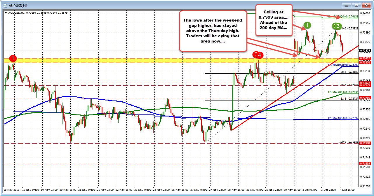 The AUDUSD moved higher in the Asian session into the London session and in doing so retested the high from yesterday. The highs today stalled right at the level (at 0.73928). That is not encouraging for the buyers, and they have turned around and sold.