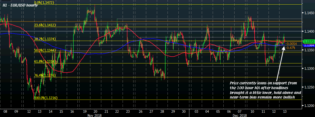 EUR/USD was trading steadily around 1.1380 levels before the headline here briefly brought it lower to 1.1367. But price is finding some support at the lows for the day as buyers are leaning on the 100-hour MA (red line) @ 1.1371 to keep up the near-term bullish bias in the pair.