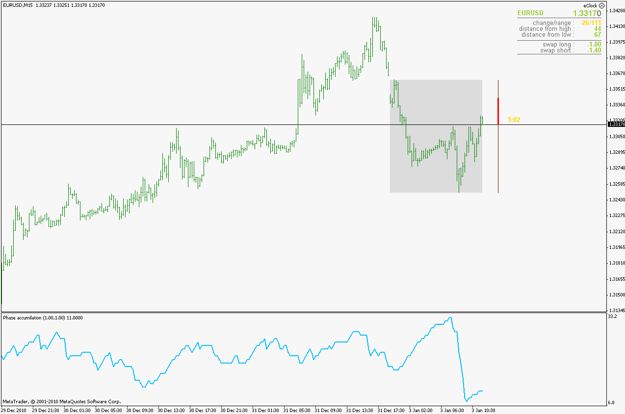 John Ehlers made also an indicator called Phase accumulation. I did not find a working version of it for metatrader 4 (the ones I found are with too much deviations from the original, so the usage of those is rather limited) so made one. The idea (in short) is to find how many bars does it take to add up every bars phases and to reach certain cycle (Ehlers uses only 1 full cycle but I decided to make it as a parameter where you can choose for how many cycles do you want to check the phases for - the "why" I did it will be explained later)