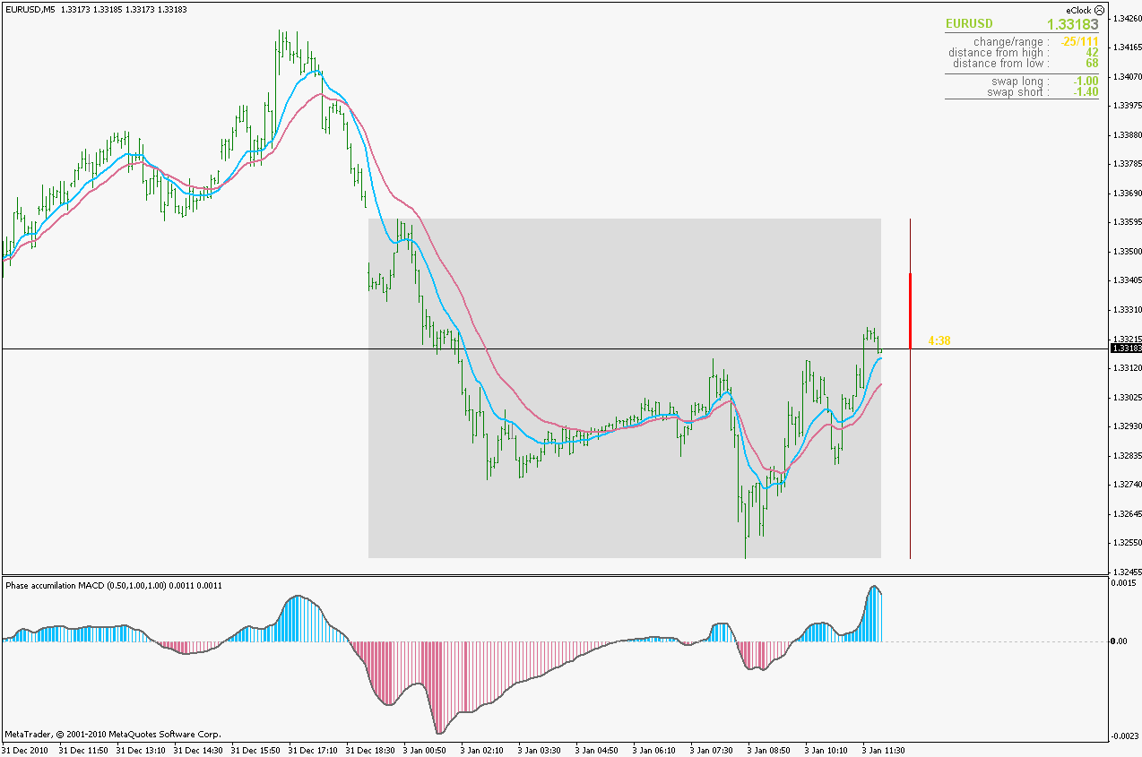 So, the way it is calculated, it gives a kind of a "perfect" period that should be applied to some indicator. And now the "why" variable cycles parameter : if we test just 1 full cycle then the speed of an indicator can not be changed (it will depend solely on data) and that way some indicators that could use this way of calculating periods could not benefit from it : averages, MACD, and so on ... But with variable cycles they become "controllable" and in that way, much more usable. So here are two offsprings of the Phase accumulation : Phase accumulation EMA (so adaptive) and Phase accumulation MACD (adaptive again). On the picture : Half cycle EMA and full cycle EMA, and the same cycles MACD