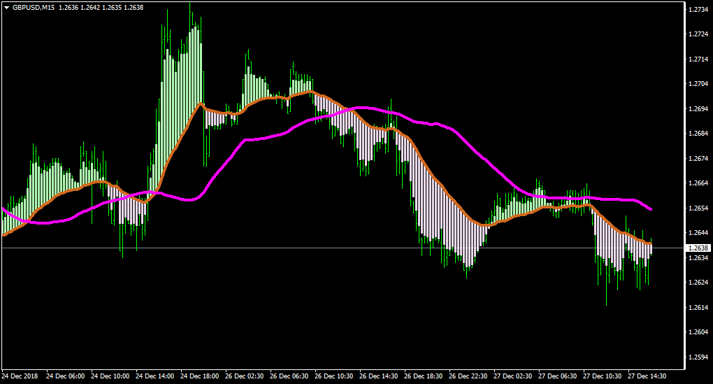 i think it is simply 2 ema (3-13) crossing filled