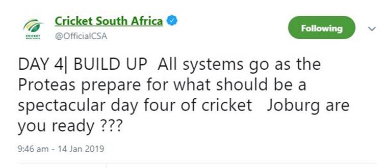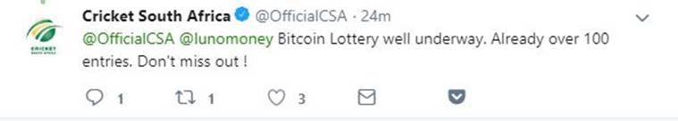 The official Twitter account of South African cricket board (OfficialCSA) was compromised overnight resulting in multiple tweets trying to sell bitcoin lottery. It all began at 4.20 AM IST on Monday with the tweet stating, “@OfficialCSA is partnering with @lunomoney for the fist South African Bitcoin Lottery. Simply send 0,01 BTC to 13My18T92DCzGdrtiCgRuS32T6rFLjnG56 and your BTC Wallet Address will be entered into a BTC Lottery for 20BTC (That’s Over R1Mil). Lottery closes at 15 Jan @ 10PM.” with two more tweets around the topic. The compromised nature and spam tweets continued in the morning with two more post 9 AM in the Indian time zone.