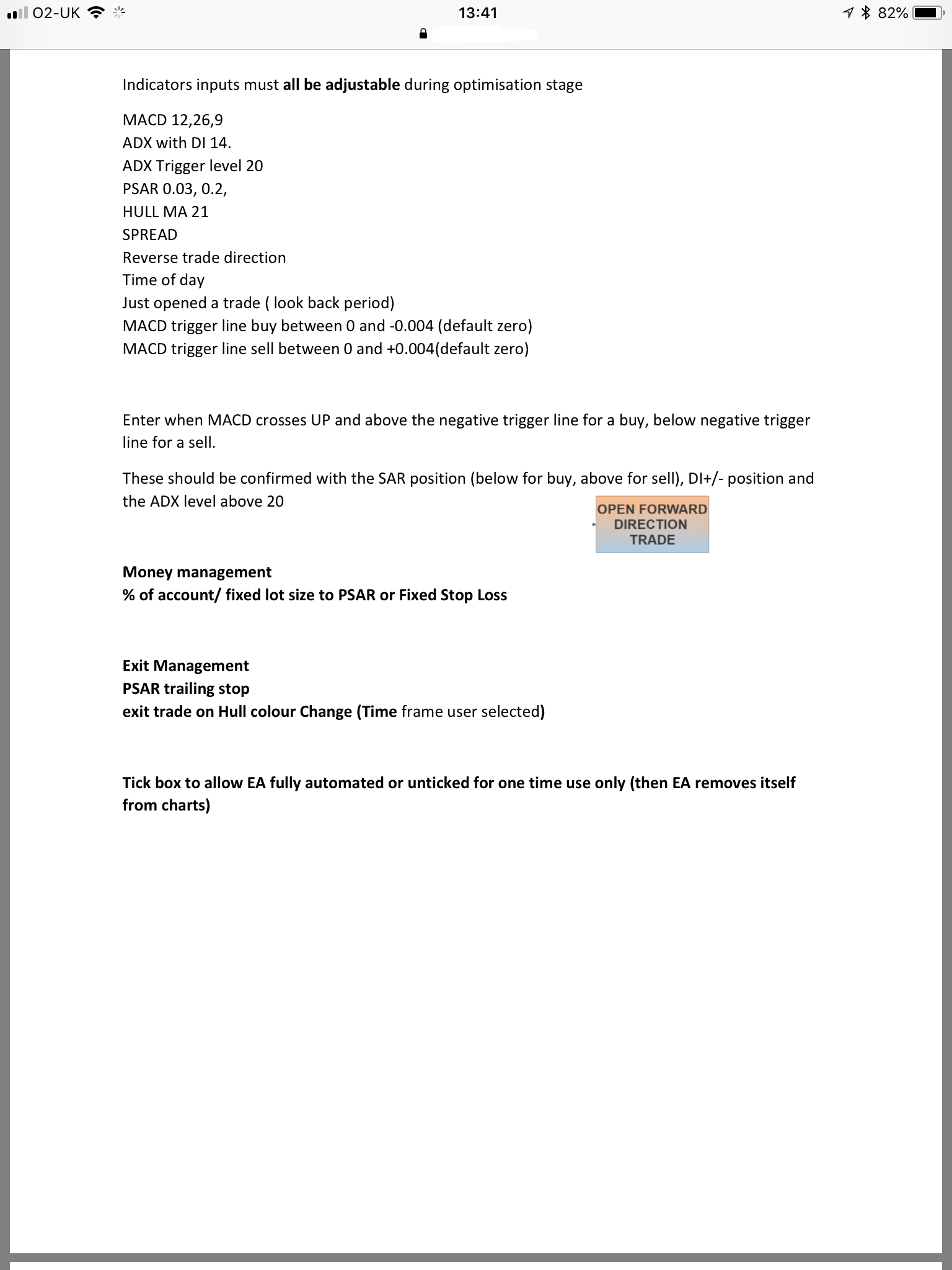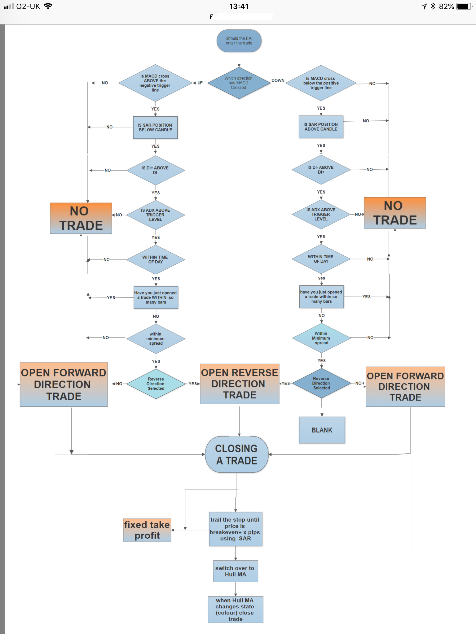 Hello, I’m after recommendations on coders that can help me create an EA. I like the quality of this group . I’ve attached screen shots and a flow diagram to explain how I would like it to operate . It’s based on MACD, ADX and PSAR. Using a Hull moving average or fixed TP to exit. Along with other conditions . Could someone let me know how much this is likely to cost, for a quality programmer to do. and if anyone can help me out. Many Thanks. Darren. See attached. must be able to optimise in the strategy tester ( mt4)
