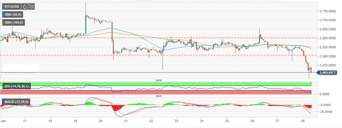 The signals from the technical indicators like the Relative Strength Index (RSI) and the Moving Average Convergence Divergence (MACD) are still negative at press time. BTC/USD is exchanging hands at $3,415, besides there is an ongoing bearish momentum that could break below $3,400 in the short-term unless support is established.