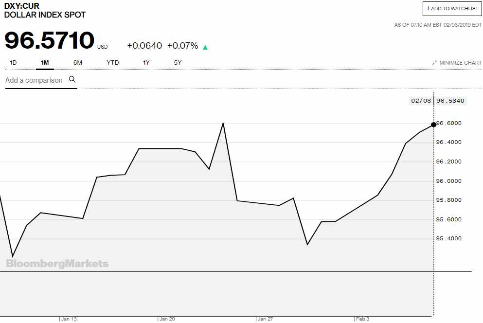 Overview: As North American traders return to their posts to put the finishing touches on the week's activity, the Dollar Index is extending its advance for a seventh consecutive session. If sustained, it will be the longest advance since February 2017. The rally was sparked after the dovish FOMC statement had sent the greenback lower and the employment data raised the possibility that the Fed overreacted to the stock market volatility. The S&P 500 turned back from the 200-day moving average and gapped lower yesterday (~2719-2724) setting the tone for the still holiday-thinned Asian markets, where the MSCI Asia Pacific Index fell for a third session, to snap a four-week rally. European shares are faring better, and Dow Jones Stoxx 600 is poised to extend its streak for the sixth week. Benchmark 10-Year bond yields are mostly a little lower. Oil is trading heavily, and with WTI for March delivery near $52.40, it is off more than 5% this week, the largest decline since late December. On the other hand, the shock from Vale is still behind iron ore's surge. Today's 5% rally bring it to a five year high.
