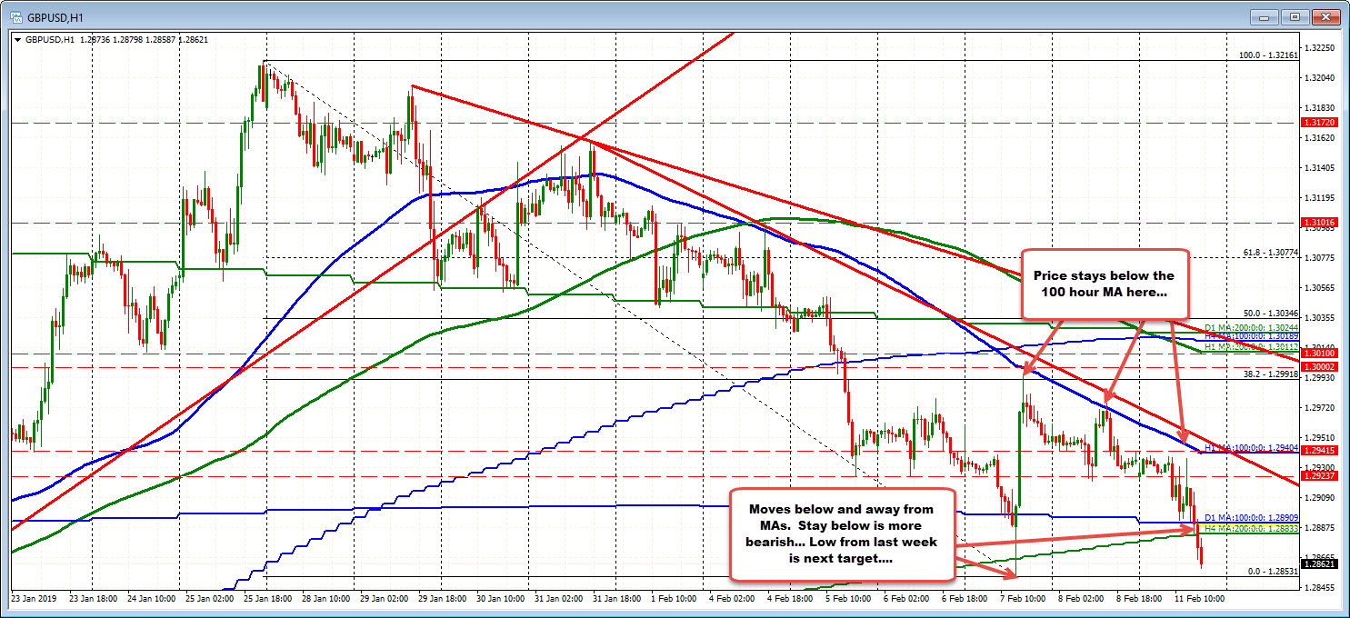 The GBPUSD is making a break to the downside. Earlier, I wrote how the pair was testing the 100 day MA and 200 bar MA on the 4-hour chart at 1.28909 and 1.28833 respectively, with a narrow trading range.
