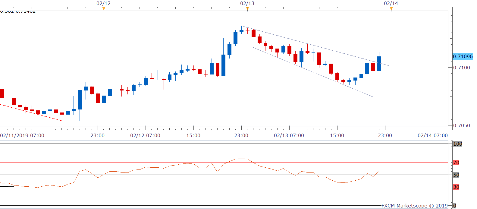 A falling channel breakout would be confirmed if the current hourly candle closes above 0.7105. That would open up upside toward 0.7121 (Feb. 13 high) and 0.7136 (Feb. 12 high). On the downside, support is seen at 0.7100 (50-hour MA) and 0.7085 (previous day's low).